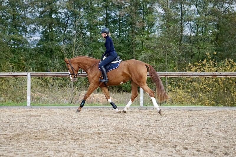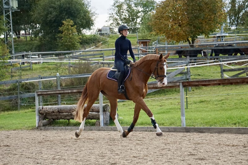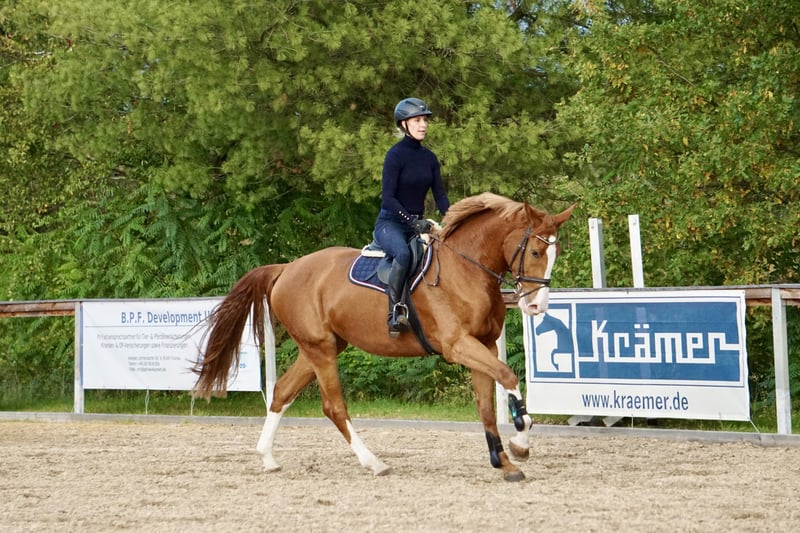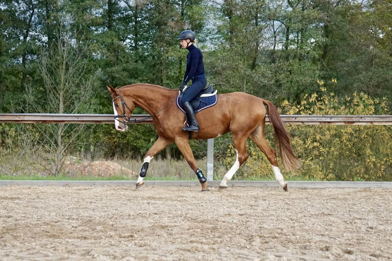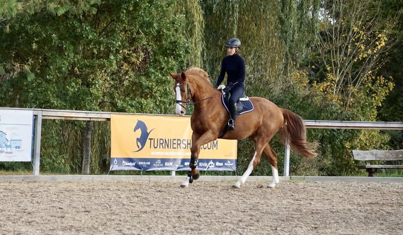 Nuestra propia yegua de 4 años, de color alazán, está a la venta. Tiene una altura actual de aproximadamente 1,69 m. Esta joven yegua ha crecido en un entorno de manada, de manera adecuada y respetuosa con su bienestar, y fue montada con cuidado el año pasado. Ya realiza pequeños recorridos de salto, ha estado en campo y ha demostrado ser valiente y dispuesta en estas ocasiones, incluyendo atravesar agua. Esta yegua salta con claridad, tranquilidad y suficiente impulso. Debido a falta de tiempo, ha tenido periodos de descanso en paddock y aún no ha sido presentada en público en competición. Se muestra siempre tranquila y confiable, ya sea en la pista, en el paddock o en el campo. Tiene un carácter bastante calmado y equilibrado, aunque también puede mostrar energía cuando es necesario. En su trato es amigable, sencilla y muy obediente, tanto con el herrador como al cargar y en la manada. Un caballo en desarrollo ideal para jinetes ambiciosos que buscan un ejemplar honesto, con ganas de aprender y confiable. Está vacunada regularmente, desparasitada y ha sido presentada al herrador. Actualmente no dispone de un certificado de salud (AKU), pero puede realizarse si se solicita. Buscamos para ella un hogar amoroso donde siga desarrollándose deportivamente. Si está interesado o tiene alguna pregunta, no dude en llamarnos al 0171-4239087. También podemos enviar vídeos por WhatsApp.