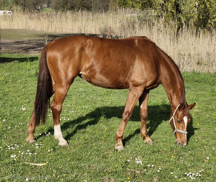 Large-framed German riding horse – Elegant chestnut mare, born 2022 For sale is a beautiful 3½-year-old German sport horse mare. With her striking chestnut coat and an impressive height of 17.7 hands, she is a true eye-catcher both visually and in terms of temperament. She demonstrates talent over fences and has three very good basic gaits. The mare is character-wise impeccable and possesses a pleasant, balanced demeanor, making her suitable for both ambitious leisure riders and competitive riders. She is also very interesting for breeding purposes. As a foal, she was awarded premium status and was reserve champion in the show jumping ring. X-ray images available! Due to a minor issue on the X-ray, she is offered at a significantly reduced price. Please feel free to contact me for further information or if you are interested.