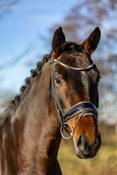 Deze bijzonder mooie bruine merrie overtuigt door haar hoge kwaliteit, rijvaardigheid en een opmerkelijk heldere geest. Een paard voor veeleisende ruiters dat toch enthousiasmeert door haar eerlijkheid en ongecompliceerde karakter. Wat vooral opvalt, is haar zeer goede galop, krachtig, gereguleerd en goed springend door het lichaam. De draf toont veel expressie en schoudervrijheid, de stap is duidelijk en ritmisch. In totaal beschikt ze over drie zeer goede basisgangen, die een degelijke en perspectiefrijke dressuurmatige opleiding mogelijk maken. Onder het zadel laat ze zich zeer goed werken, is licht aan de hand, alert en altijd bij haar ruiter. Ze blijft helder van geest, vertoont geen overreakties en geeft altijd een veilig gevoel. Juist deze combinatie van kwaliteit en betrouwbaarheid maakt haar ook interessant voor minder ervaren ruiters of goed rijdende jongeren die op zoek zijn naar een hoogwaardig jong paard. In de omgang is de merrie absoluut braaf, vriendelijk en vertrouwelijk. Ze is mensgericht, knuffelig en in het dagelijkse handling eenvoudig in de omgang – een paard dat je gewoon graag om je heen hebt. Haar afstamming onderstreept eveneens haar hoge kwaliteit: Ze is een directe nakomeling van Quarterback, via moederszijde terug te voeren op Sandro Hit en Fidermark. Deze lijnen staan voor rijvaardigheid, expressie en bereidheid tot presteren en hebben talloze succesvolle dressuurpaarden voortgebracht. Een zeer bijzonder paard met veel kwaliteit, veelzijdig inzetbaar, voor veeleisende ruiters evenals voor ambitieuze jonge ruiters. Ze bevindt zich in het hogere prijsegment. Locatie: Rosenheim