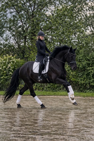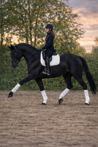 We are offering our homebred mare, Diantima, for sale. She is a direct daughter of the current team European dressage champion. Diantima was gently backed at the age of three, foaled at four, and subsequently continued her training. She is proficient in elementary dressage movements, already performing flying changes and lateral work, and is progressing towards Medium level dressage. The mare impresses with her excellent work attitude: she is consistently diligent, motivated, and easy to handle. Thanks to her balanced temperament, she is also well-suited for children and is immediately ready for the Children’s class. In the video, she is ridden by our 13-year-old daughter. The fact that she can be ridden through a water sprinkler speaks volumes about her calm nature. Her extraordinary pedigree, being a daughter of Fürstenball out of Fürstenlook, not only gives her an elegant appearance but also excellent sport potential. On her dam’s side, she comes from the Flamboyant OLD line, which makes her highly interesting for breeding. The sale is solely due to our reduction of stock. Having bred and cared for her ourselves for over seven years, we wish for her to find a loving home with a family environment and optimal conditions. For further information, please contact us by phone: 0179 7022766.