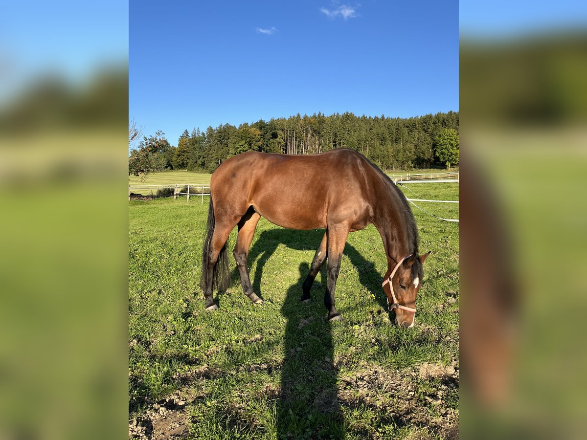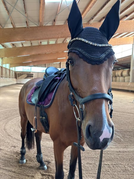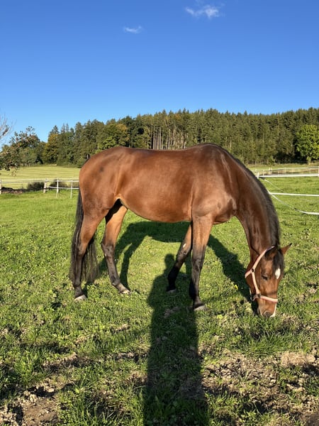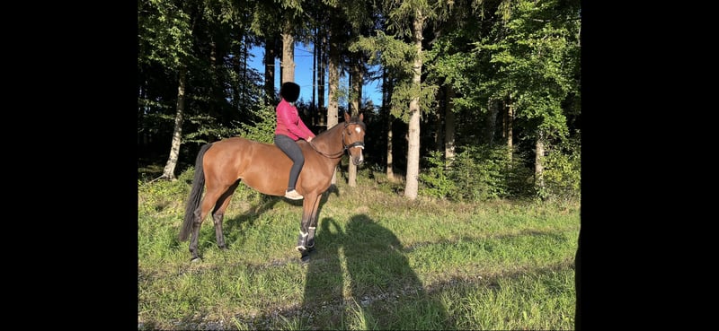 Verkaufsanzeige - 7-jährige Stute (*Juli 2018) 165 cm Charakter & Umgang sehr brav im täglichen Umgang, kann ohne Weiteres von unserer 12-jährigen Tochter geputzt, geführt und longiert werden. - sie hat sehr gute Hufe und läuft daher barhuf, auch im Gelände - geländesicher: sowohl alleine als auch in der Gruppe - Maschinen, Fahrzeuge, andere Pferde und Hunde sind für sie kein Problem - kann als Handpferd mitgenommen werden oder selbst ein Handpferd führen - sie wird bei uns regelmäßig als sicheres Begleitpferd für junge Pferde im Gelände eingesetzt - sie bockt und steigt nicht und geht auch nicht durch - springt kleine Sprünge (nicht wirklich gefördert) - geht auf den Hänger Im Gelände ist sie ein wahrer Schatz und geht einzeln und in der Gruppe ins Gelände - immer souverän voraus. Man kann mit ihr auch von der Gruppe wegreiten, an Koppeln mit tobenden Pferden vorbei oder auch einfach querfeldein etc. Alles kein Problem. Im Gelände kann sie einfach am langen Zügel geritten werden und war auch schon gebisslos und ohne Sattel draußen. Das Hoftor kann mit ihr vom Sattel aus aufgemacht und geschlossen werden. Ich bin sie auch schon einfach nur am Halfter geritten. Unsere 12-jährige Tochter war mit ihr auch schon als Handpferd im Gelände. Unsere zweite Stute nehme ich auf ihr oft als Handpferd mit. Sie wird mitgenommen, wenn die jungen Pferde ans Gelände gewöhnt werden. Hier ist sie absolut charakterstark und zeigt sehr gute Nerven. Lässt sich auch von ängstlichen Pferden in der Gruppe nicht verunsichern. Voraussetzung ist, dass sie einen Reiter hat, zudem sie Vertrauen hat und ihr Sicherheit geben kann. Ein Angstreiter oder Anfänger ist daher trotz ihrer Gelassenheit nicht für sie geeignet. Auch Bodenarbeit und Kunststücke machen ihr sehr viel Spaß - sie liebt jede Art von Aufmerksamkeit und ist wahnsinnig verschmust. In der Dressurarbeit ist sie anspruchsvoller. Sie benötigt eine feine Hand und einen Reiter, der das notwendige Gebühr mitbringt und nicht mit dem Kopf durch die Wand will. Jemand, der sich am Zügel festhalten muss, ist nicht für sie geeignet, Bocken oder Durchgehen tut sie nicht. Mit entsprechendem Können läuft sie jedoch auf etwa A-Niveau. Aufgrund ihrer Sensibilität und ihres Anspruchs wird sie ausschließlich als Freizeitpferd verkauft - am Liebsten als reines Geländepferd. Sie ist ideal für: - ausgedehnte Geländeritte - Wanderritte - Distanzritte - Orientierungsritte Sie kennt Offenstall und Boxenhaltung. Sie ist ein tolles, verlässliches Pferd für einen Freizeitreiter, der ihren Charakter zu schätzen weiß und ihr die nötige Sicherheit geben kann. Bei ernsthaftem Interesse freuen wir uns über eine Nachricht mit kurzer Vorstellung. Platz absolut vor Preis. Auf Wunsch kann die Ausrüstung mitübernommen werden. Tel.: 0160 97 23 70