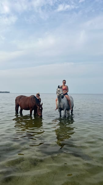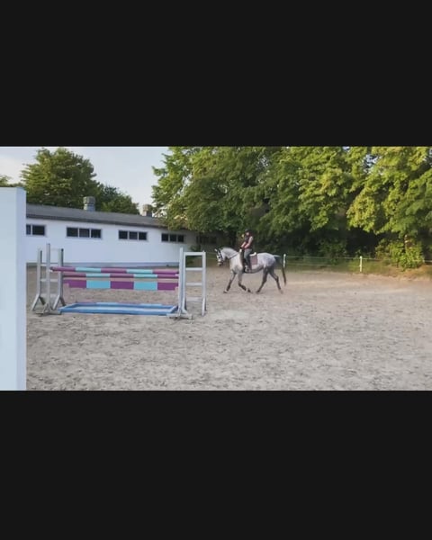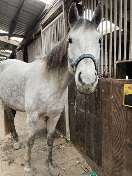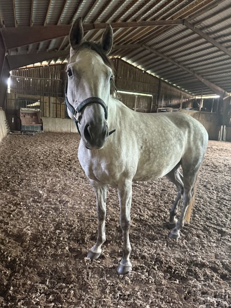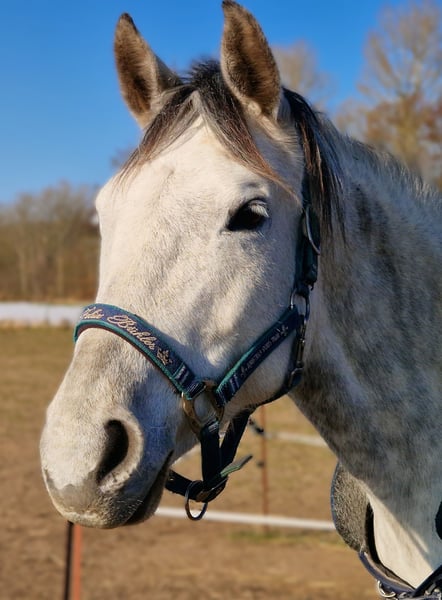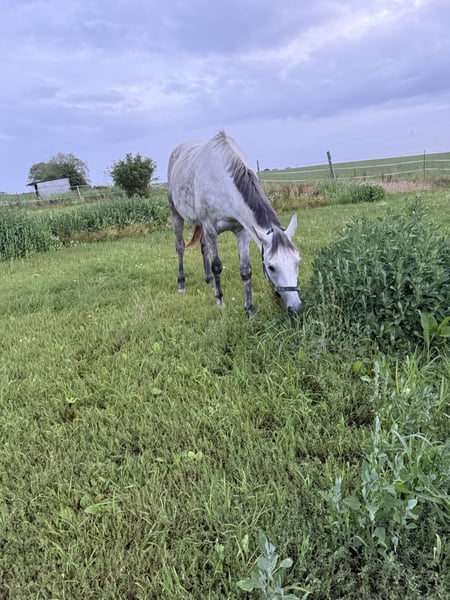 With a heavy heart, I must part with my 9-year-old gray mare Hedy. She is a people-oriented, affectionate mare, has never been aggressive with me, and stands at a height of 163 cm. Hedy is quite dominant and can be a bit sassy among her peers, typical mare behavior. I have had her since she was 4 years old. Due to a hoof roll condition (front right) that was diagnosed when she was 6, she is only conditionally rideable. Therefore, she is not suitable for sports! She is a great leisure partner and loves to be pampered. Trail rides, outdoor arenas, and indoor riding are no problem for her. In the last 2 years, she has undergone 2 treatments for sarcoids, which have healed excellently. She has no issues with the farrier or trailer loading. Currently, she is barefoot. She will be sold with equipment such as bridle, blankets, halters, etc.
