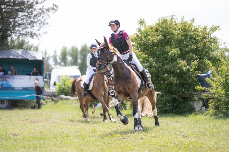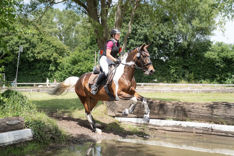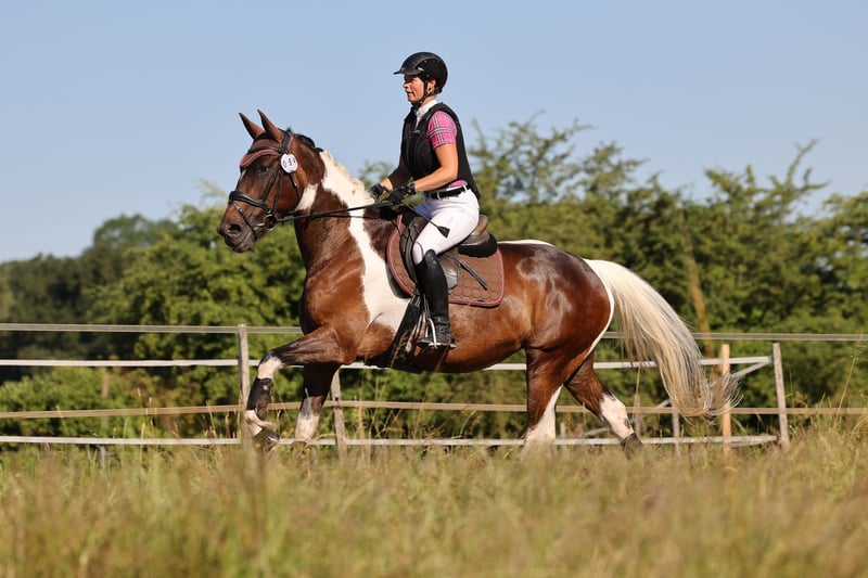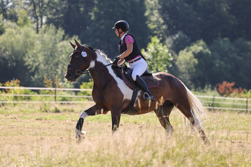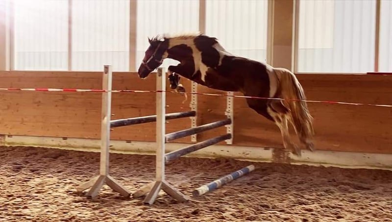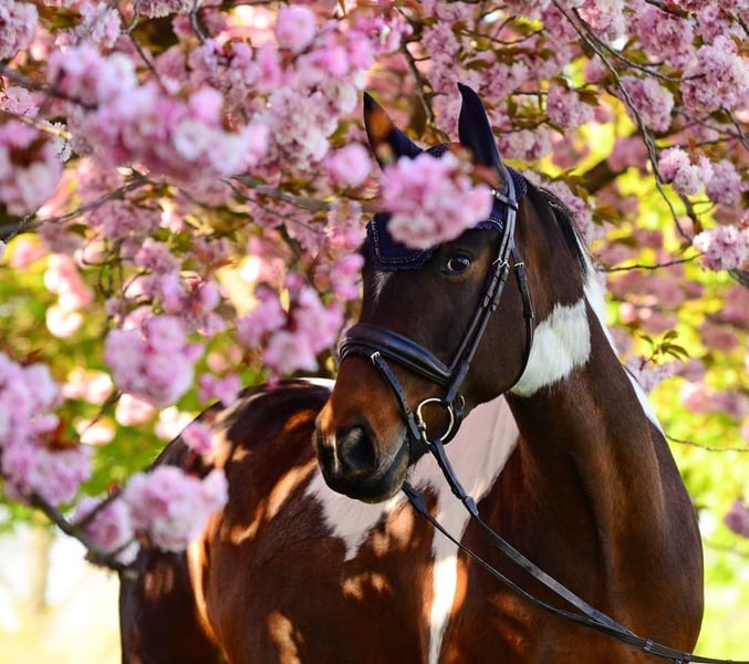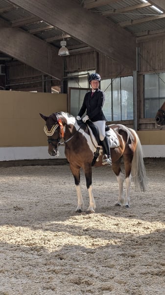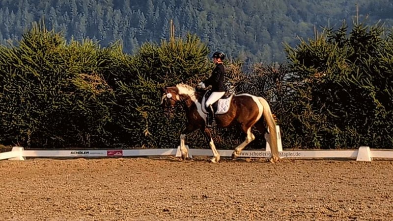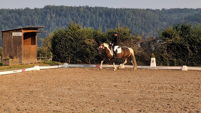 German Riding Horse – Versatile Pinto Mare I am looking for a loving and competent rider to provide a great home for my self-bred, absolutely lovable and performance-ready mare Duke's Coloured Symphony (Roxy), 9 years old, approximately 1.64m, registered as a German Riding Horse, sired by Duke of Hearts xx. Roxy initially impresses visually with her striking, even pinto coloring, 4 white socks, and her friendly nature. She is well and realistically trained and shows great promise in both eventing and dressage. Her balanced temperament makes her interesting for both experienced riders and ambitious pony transitioners; however, I would like her to be in experienced hands (from A level), so she is not suitable as a children's riding horse. The mare is a gem to handle, always manageable, and has already gained experience in all settings. Whether riding out, in groups, with or without a lead horse, in circus training, groundwork, long-lining, etc. This season, she has been gently introduced to competition sports, and she surprised us as a ribbon collector with her incredible confidence, calmness, and willingness to perform. She won all 5 cross-country tests with excellent scores ranging from 8.0 to 8.6 and is now ready to kick off the upcoming season in the VA after a solid winter training! She has also received scores up to 8.0 in show jumping and A-level dressage. In show jumping, she has never refused and always wants to jump, regardless of water, ditches, trakehner, colorful or fluttering obstacles. She has inherited the heart and incomparable attitude of her mother Campari and the athletic constitution of her father, the successful eventing stallion, DUKE OF HEARTS XX. She is the only pinto offspring of this top stallion. She is healthy, regularly vaccinated, dewormed, and is well-mannered for the farrier and loading. Roxy is very dear to me, and I want her to be placed in a great home. It is very important to me that she continues to be developed in a realistic and fair manner, with fun, joy, and fairness towards this wonderful horse. I am also interested in providing a spot for an ambitious rider from A level within a 200 km radius of Freiburg!