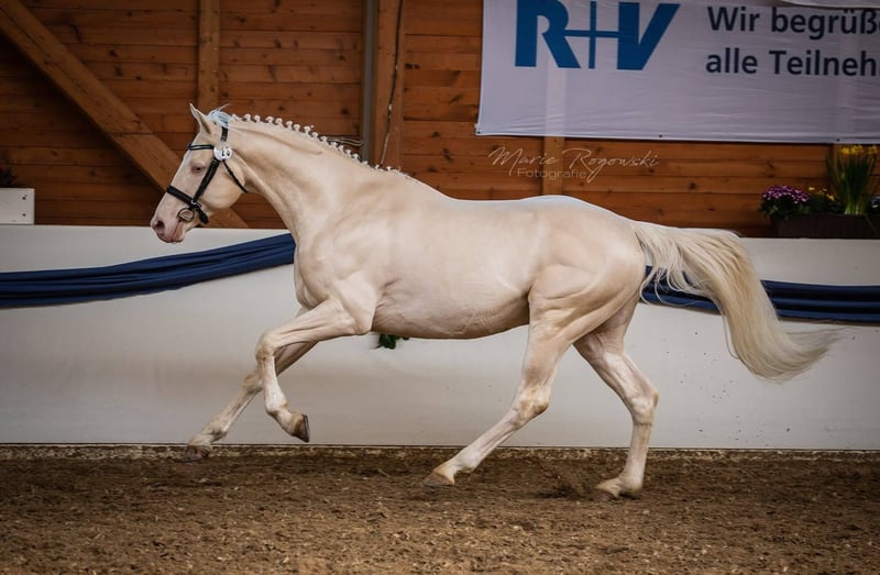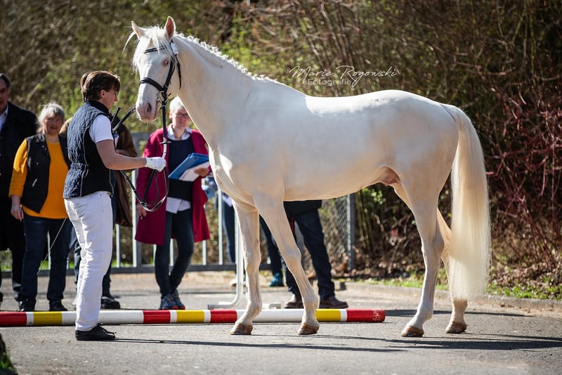Étalon à sang chaud de couleur cremello (double dilué) | né en 2010 | 169 cm AES, ZSAA (Dt. Edelblut), Royal Belgian Palomino, approuvé Admis pour KWPN-A, Zangersheide, IFCE, ISR/Oldenburg N.A. Test de performance des étalons de 70 jours à Neustadt/Dosse + HLP-Sport Marbach Génétique : e/e A/a Cr/Cr ECVM : sans résultat (2022, programme de recherche international) WFFS, CA, SCID : exempt Alasdair GF a connu de nombreux succès sportifs pendant plusieurs années et s'est classé jusqu'au niveau L dans des épreuves de cross-country. En 2015, il a terminé 9e du classement ZfDP TOP TEN des chevaux de concours complet, alors qu'il était le plus jeune cheval en lice. Il a produit dans le monde entier une descendance colorée et performante sur le plan sportif, tant dans l'élevage de chevaux à sang chaud que dans des projets de partbred. Élevé par le haras Falkenhorst (Gwendolyn Gregorio), Alasdair est issu d'une lignée traditionnelle de chevaux de couleur et d'améliorateurs. Son père, RFF The Alchemist xx, a été importé des États-Unis (Red Fox Farm) et a été l'un des premiers pur-sang doublement éclaircis à être approuvé pour la reproduction en Allemagne. Alasdair est testé pour ses performances, a un caractère fort et un type clair. Il transmet avec une grande constance des poulains modernes, puissants dans leurs mouvements, avec de la substance, des membres solides et une belle couleur - 100 % de clarification avec la combinaison génétique correspondante. En tant que Cremello, il transmet dans tous les cas un gène crème. Grâce à son patrimoine génétique, il convient aussi bien aux juments de sang chaud classiques qu'aux projets visant à améliorer la race.