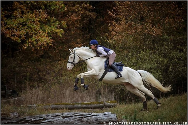 Warmblood stallion in Cremello (double dilute) | born 2010 | 169 cm AES, ZSAA (German Edelblut), Royal Belgian Palomino, licensed Approved for KWPN-A, Zangersheide, IFCE, ISR/Oldenburg N.A. 70-day stallion performance test Neustadt/Dosse + HLP-Sport Marbach Genetics: e/e A/a Cr/Cr ECVM: no findings (2022, international research programme) WFFS, CA, SCID: free Alasdair GF enjoyed many years of sporting success and was placed in cross-country competitions up to class L. In 2015, he was the youngest horse to take 9th place in the ZfDP TOP TEN eventing horses. He has produced colourful, athletically talented offspring worldwide – both in warmblood breeding and in partbred projects. Bred by Gestüt Falkenhorst (Gwendolyn Gregorio), Alasdair comes from a traditional colour and refiner line. His sire, RFF The Alchemist xx, was imported from the USA (Red Fox Farm) and was one of the first double lightened thoroughbreds with Trakehner approval in Germany. Alasdair is performance-tested, strong in character and clear in type. He consistently produces modern, strong-moving foals with substance, conformation and colour – 100% lightening with the appropriate gene combination. As a cremello, he always passes on a cream gene. Due to his genetic background, he is suitable for both classic warmblood mares and projects with breeding goals.