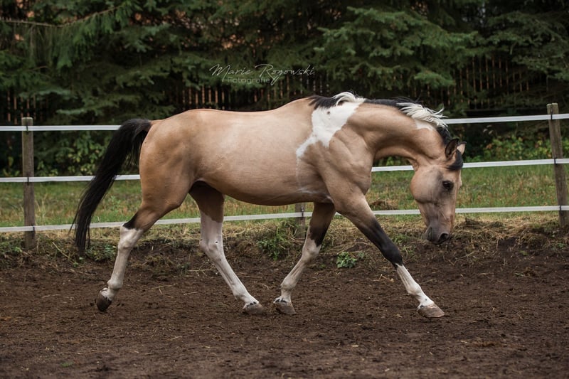 Caballo de doma alemán | Tobiano buckskin | 2007 | aproximadamente 1,70 m Aprobado por VZAP, AES, ECHA-ESV, ZfdP | Prueba de rendimiento de semental realizada (VZAP HLP 2014 - Nota 7.0) Registrado en Zangersheide y IFCE Francia Genética del color: Ee Aa Cr/n TO/n Testado genéticamente: SCID, CA, WFFS y PSSM2 - negativo Talisman GF es un semental de hermoso aspecto, bien conformado, con un llamativo color especial y ascendencia deportiva. Destaca por sus movimientos básicos de buen carácter, una disposición tranquila y una estructura armónica. En el día a día, Talisman se muestra equilibrado, confiable y atento. Vive en paddock abierto, es fácil de manejar, tiene experiencia en monta y está familiarizado con todos los procedimientos en la yeguada. Su pedigrí combina sangre deportiva sin líneas de Samber, Ico ni Camaro. El padre, Taarlon (caballo de élite, salto M), desciende de Rigoletto (Ramzes AA), y la madre, Morgenlicht GF, proviene de Morgengold II y Wilderer, de una línea con rendimiento probado, color, fundamento y buen carácter para la doma. Es padre de dos sementales aprobados: Traumprinz GF (Australia) y Tagtraum Falkenhorst Z (Alemania/Francia), además de varios ejemplares con éxito deportivo y en la cría en Europa y Suiza.