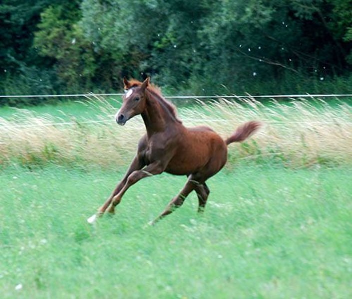 Cello C (geb. 11.04.2025), ein langbeiniges, bildschönes, korrektes, sich auch sehr gut und leichtfüßig bewegendes, pfiffiges Dunkelfuchshengstfohlen (Fohlenprämie!) - Endmaß ca. 169 cm - mit 3 weißen Söckchen und schöner Zeichnung im Gesicht. Sein Vater ist der im Springsport hocherfolgreiche Rapphengst Central Park (Casall x Contender, Station Maas-Hell), der in seinem Pedigree top Springer vereint und mütterlicherseits auf die gekörten Vollbrüder Chello I-III zurückgeht. Mutter dieses Nachwuchskrachers ist unsere typvolle, doppelt veranlagte Prämienstute Sissy C (Samenco K x Camaro, Lehar, Ladykiller xx). Sie brachte mit Ludwig´s As bereits einen bunten Sohn, der sich 5-jährig unter den 20 besten Springpferden in Belgien behaupten konnte und dort begeistert weiter gefördert wird. Cello C ist charakterlich cool und aufgeschlossen, lernt super schnell, zeigt jetzt schon, daß er springen will und kann, wegen seines interessanten Blutanschlusses auch für die Vielseitigkeit und die Zucht interessant. Ein Traumtyp und künftiger Sport- oder Freizeitpartner mit allerbesten Anlagen. Nur in liebevolle, gern fördernde Hände. Mehr Infos auf www.sportschecken.de oder unter 0177/8140272. Absetzen ist ab sofort möglich, derzeit genießt er aber noch seine gemeinsame Zeit mit Mama.