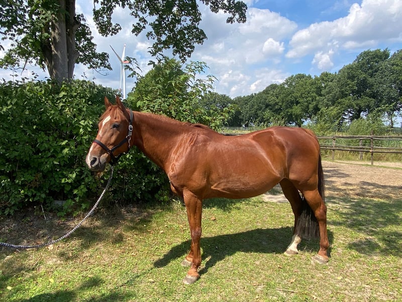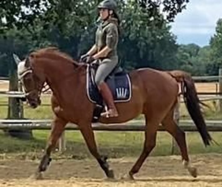 Mac bringt eine solide Grundausbildung mit, geht locker über Stangen und kleinere Sprünge und zeigt sich dabei arbeitswillig und aufmerksam. Unterm Sattel zeigt er sich bei klarer, souveräner Reiterhand zuverlässig und motiviert – bei unsicheren Reitern kann er allerdings etwas hektisch werden. Kein Steigen, kein Bocken! Aber: Kein Anfängerpferd. Mac braucht eine*n Reiter*in mit klarer Linie, der/die ihm Sicherheit gibt, denn dann ist er eine treue Partnerin für viele schöne Stunden im Gelände, auf dem Platz oder im vielseitigen Training. Er eignet sich ideal für ambitionierte Freizeitreiter*innen, die ein sensibles, ehrliches Pferd mit viel Potenzial suchen. Bei Interesse und/oder Fragen bitte an 01575 5817020 wenden.