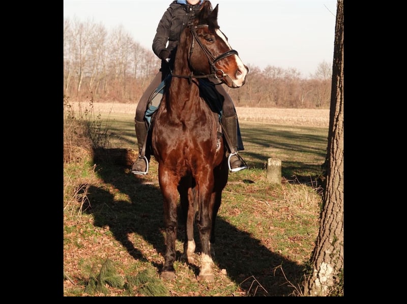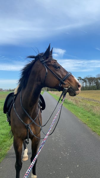Schweren Herzens muss ich leider meinen 16 Jährigen Wallach abgeben. Er ist ca. 1.68 groß und ein Deutsches Reitpferd. Er wird Freizeitmäßig hauptsächlich Dressur geritten, wir springen zwischendurch aber auch. Ins Gelände geht er alleine als auch in der Gruppe, braucht hier allerdings einen erfahrenen Reiter. Er ist vorne beschlagen, geimpft entwurmt und die Zähne sind gemacht. An seinen hinteren Rückenwirbeln sind leichte Anzeichen von Kissingspines zu erkennen, dieses beeinträchtigt ihn jedoch nicht beim Reiten. Röntgenbilder liegen vor. Er steht momentan in einer Box und ist Tagsüber auf dem Paddock/ der Wiese. Er bekommt bei uns bedampftes Heu da Reaktion auf Staub. Medikamente bekommt er keine. Im allgemeinen ist er ein liebes, arbeitswilliges Pferd, braucht jedoch einen erfahrenen Reiter. Vor dem Anhänger hat er ein wenig Angst und braucht hier einen Moment bis er drauf geht. Sattelzubehör wird gerne mit verkauft. Uns ist es am wichtigsten das er ein tolles Zuhause findet und jemanden an seiner Seite hat der spaß an der Arbeit mit den Pferden hat.