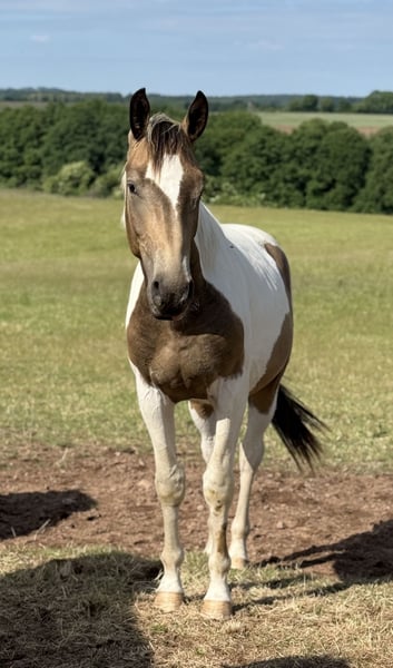 Auffallender, gleichmässig gezeichneter Hengst in goldenem, buntem Kleid. Korrekt im Fundament und äusserst angenehm im Umgang. Top Aufzucht mit viel Bewegung in hügeligem Gelände mit regelmässigem Hufschmied/ Wurmkuren und Mineralfutter gaben. Ein Youngster der in Zukunft im Vierreck, Springen und Vielseitigkeit zu begeistern weiss . Der Vater erfolgreich in der Dressur und MV Samico F mehrfach S Dressur Sieger und MVV Samber in S Dressur und M Springen erfolgreich. Standort Deutschland