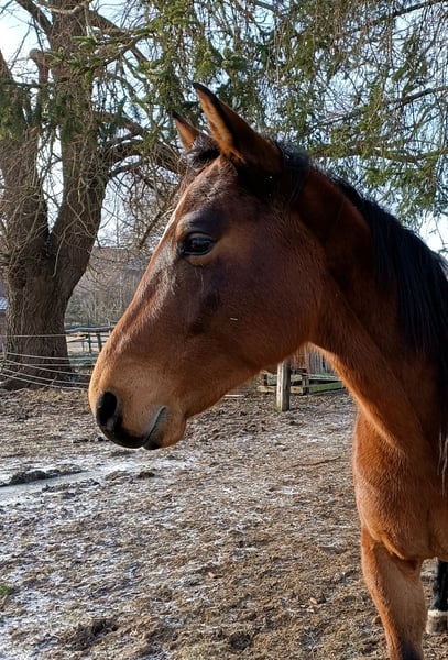 Nous proposons à la vente notre hongre de selle bai, d’environ 1,60 m de taille au garrot, né et élevé chez nous. Il est issu d’une mère hanovrienne et d’un étalon Appaloosa. Il est en bonne santé, se déplace sans problème pieds nus sur tous types de terrains, sans toux ni eczéma. Il ne nécessite pas de couverture en hiver, connaît le box et la vie en troupeau. Selon son âge, il est joueur, curieux, apprend rapidement et n’a pas peur, par exemple lors de parcours d’obstacles. Il a toujours envie de travailler et souhaite être occupé. Il a été débourré chez nous, marche en confiance au pas et au trot, recule, effectue des pirouettes en avant, et les premiers exercices en côtés commencent déjà à bien fonctionner. Le galop se travaille actuellement en longe sur la carrière. C’est un diamant brut non exploité, que l’on peut façonner à sa guise. Il possède de bonnes allures de base, un peu de potentiel en saut d’obstacles, et une attitude intrépide. Je peux l’imaginer aussi bien en compétition, en loisir ou en famille, que pour des randonnées. Actuellement, il a bien sûr besoin d’un cavalier un peu expérimenté, mais des enfants plus petits l’ont déjà monté.