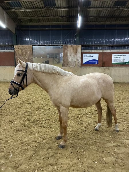 Beautiful 10-year-old Palomino mare with excellent movement, sired by Cosmopolitan-Cassini-Golden Dandy. Standing at 14.6 hh, she is available for breeding purposes and can also be ridden without a saddle. Price negotiable. The mare is located in Münster.