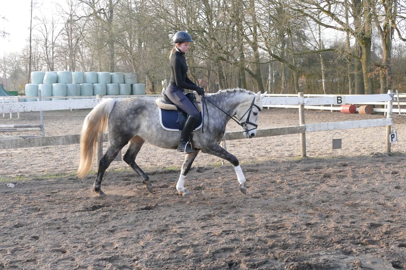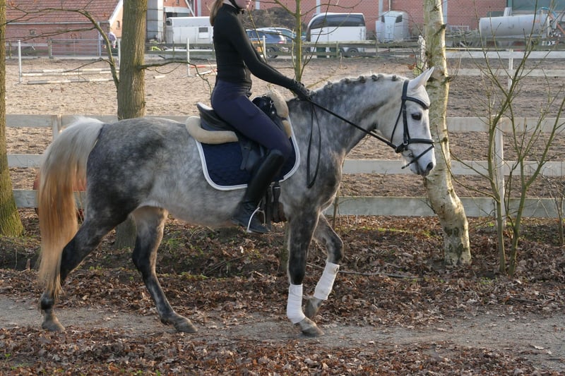 Susi est une jolie ponette de selle, équipée de trois allures de base très agréables. Elle a été monté tardivement, ce qui signifie qu’elle doit encore être davantage dressée. Chez nous, elle est monté par des jeunes cavaliers et se laisse monter calmement dans ses trois allures fondamentales. Elle a une bonne locomotion naturelle, ce qui la rend inadaptée aux débutants. Elle a également déjà effectué plusieurs sorties en extérieur très calmement et en prend beaucoup de plaisir. En manège, elle est toujours calme et obéissante. Avec une formation supplémentaire, je pourrais également l’envisager comme poney de concours, car elle possède un potentiel pour la dressage comme pour le saut.