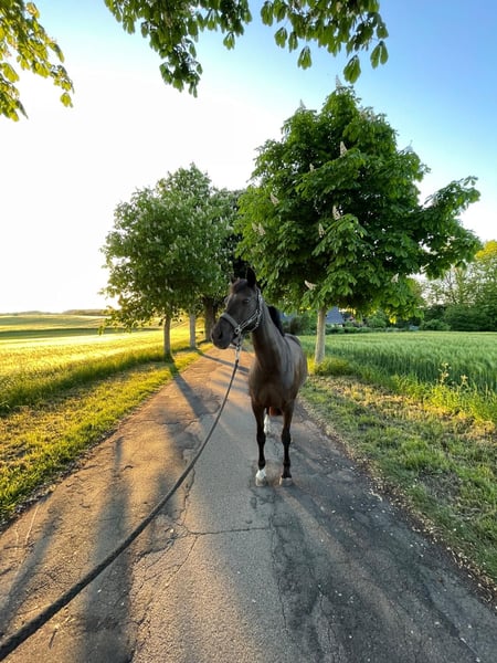 Lady to 12-letnia niemiecka kucyk sportowy dla rekreacyjnego jeźdźca. Idealnie nadaje się dla małego, lekkiego, doświadczonego i dorosłego jeźdźca o konsekwentnym, ale spokojnym stylu jazdy. Obecnie jest również regularnie jeździona na lekcjach przez 13-letnią dziewczynkę, która również radzi sobie z nią bardzo dobrze. Do jej codziennych rutyn należy jazda w ujeżdżeniu, skoki, wycieczki oraz indywidualna praca na lonży, w których chętnie bierze udział. Bardzo ceni sobie różnorodność. Żyje w boksie z wybiegiem, latem na pastwisku w ciągu dnia, a zimą na półdniowym wybiegu z piasku. Od początku roku jeździ na gołym kopycie, dzięki profesjonalnej pielęgnacji kopyt. Jeździłam z nią co tydzień na indywidualnych lekcjach. W okresach urlopowych była pod opieką instruktora. Niemieckie reitpony, klacz Kolor: ciemnogniada Data urodzenia: 2013 Wzrost: 146 cm Ojciec: Halloween Matka: Resi Ojciec matki: Magnum Cena: 12 500 € do negocjacji, w cenie wliczone siodło skokowe i ujeżdżeniowe od Selleria Equipe, wykonane na miarę, w tym roku ponownie dopasowane. Regularnie odrobaczana, szczepiona i kontrolowana stomatologicznie.