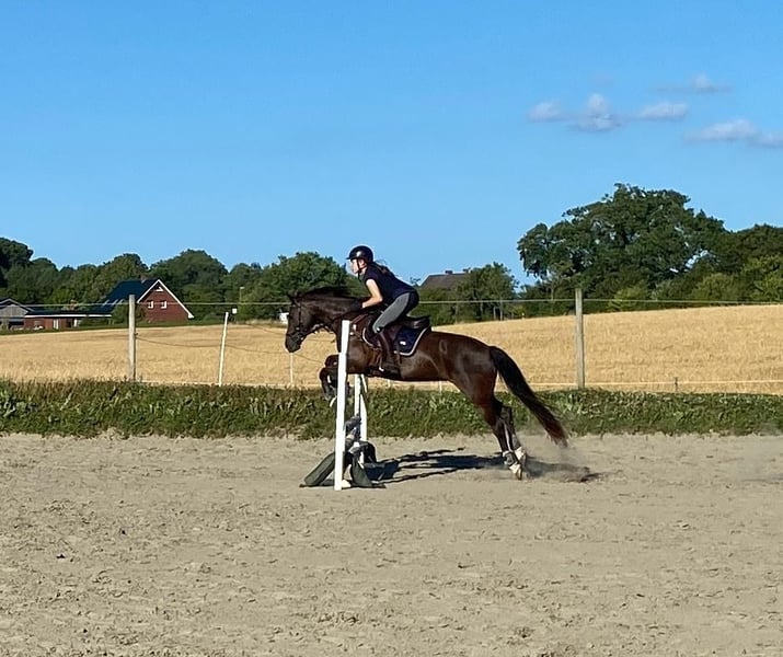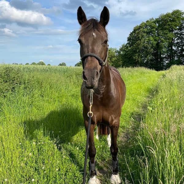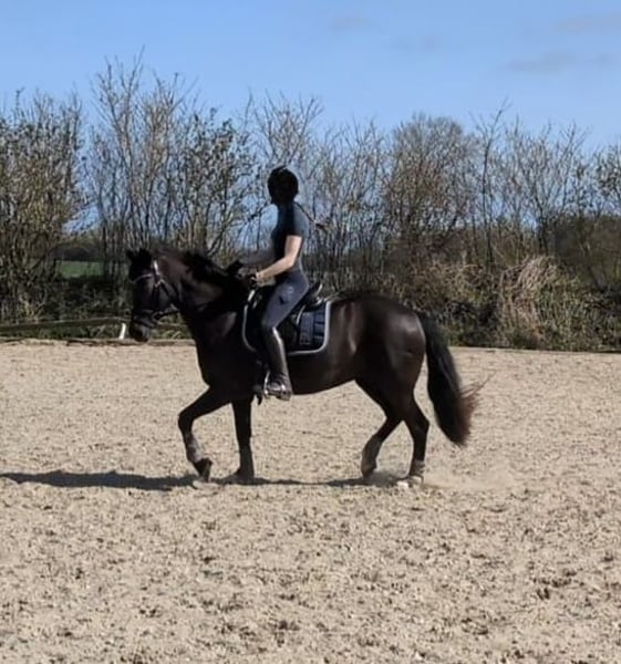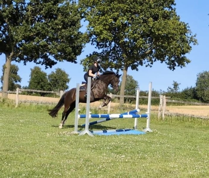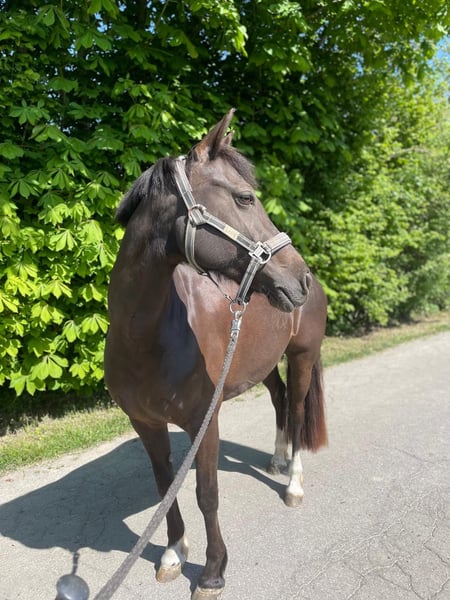 Lady is a 12-year-old German Riding Pony mare suitable for the recreational rider with a sporting ambition. Ideally, she requires a small, light, experienced adult rider with a consistent yet calm demeanor. Currently, she is also regularly ridden weekly by a 13-year-old girl in lessons, and she remains well-behaved. Her daily routine includes dressage, jumping, hacking, and individual ground work, all of which she approaches with enthusiasm. Variety is very important to her. She lives in a box with paddock access; in summer, she spends her days on pasture, and in winter, she is turned out on a sand paddock for half a day. Since the beginning of the year, she has been barefoot thanks to professional hoof care. I have been riding her weekly in private lessons. During holidays, she has been ridden under saddle by a professional rider. German Riding Pony mare Color: Dark Chestnut Date of Birth: 2013 Height: 146 cm (approx. 14.1 hh) Sire: Halloween Dam: Resi Dam's Sire: Magnum Price: €12,500 negotiable, including a custom-made jumping and dressage saddle from Selleria Equipe, recently fitted this year. Regularly vaccinated, dewormed, and dental checked.