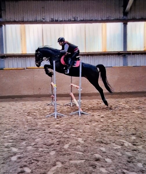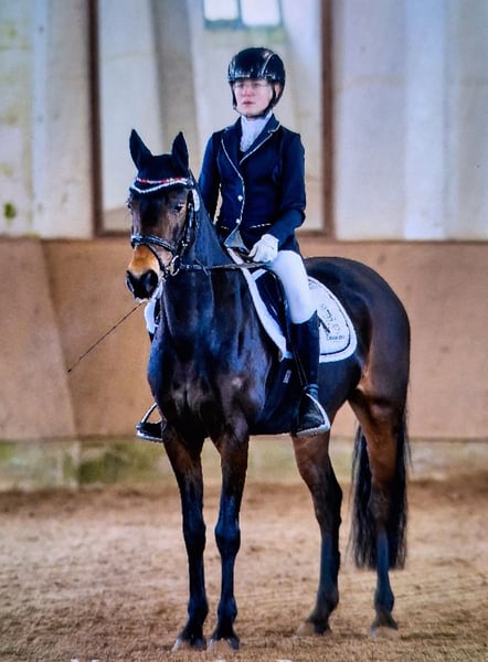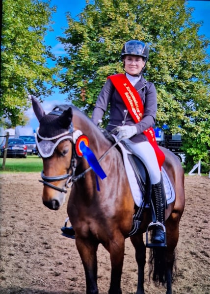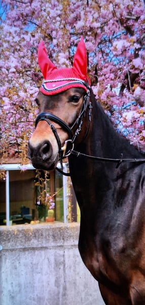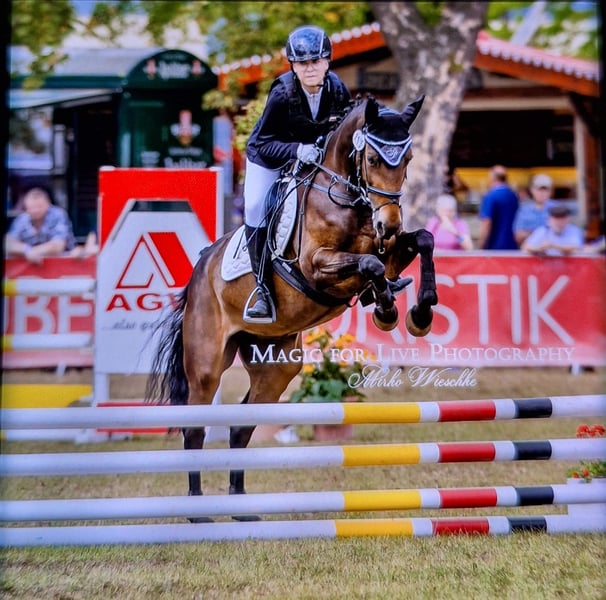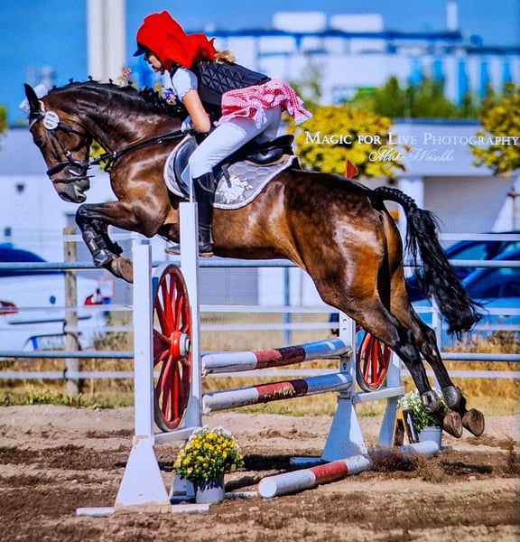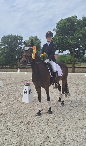 Panamera is a 13-year-old mare by Strahlemann out of Galileo/ Constantin, with a height of 154 cm (measured as an end-size pony at 148 cm). We have owned her since February 2019, having purchased her directly from the breeder. The pony has no vices whatsoever. She possesses above-average movement and an impressive presence with plenty of expression. She is the perfect partner for advanced dressage, eventing, or show jumping. Due to her size, she is ideally suited for both young, emerging riders and more experienced equestrians. Panamera has been regularly presented at riding days and competitions, achieving multiple wins in dressage up to A* level and placements in A** classes. During winter training, she has been prepared with dressage exercises at L-level and is fully ready for the upcoming competition season. In jumping, she has been competed at E-level with successful placements. In training, she has jumped up to A-level but could benefit from further development in this discipline. She clearly enjoys jumping, which makes a sport career in show jumping or eventing very feasible. The pony has already participated in cross-country training sessions with her rider, which she thoroughly enjoys. In handling, Panamera is well-mannered, friendly, and very affectionate due to her people-oriented nature. In the herd and stable, she is approachable and curious towards other horses and humans. She is the dominant mare in her herd. Currently, Panamera spends her days on pasture in a mixed herd and stays in her box at night. She is shod, load-trained, and very well-behaved during veterinary visits (vaccinations and teeth checks). She is four-hoofed and has been regularly vaccinated and dewormed. Her teeth are checked as needed (at most every two years). She has always been in excellent health with no prior illnesses. Panamera has previously foaled a foal, which she delivered and cared for without any issues. Panamera is a pony with a big heart. We are therefore seeking a new, 5-star home where she can ideally find her final place. The mare is not available as a school horse or to dealers. Price is secondary to finding the right home. This is not an emergency sale. If you are looking for a reliable and talented partner with whom to achieve shared success, please contact us to arrange a viewing and trial ride. A trial ride costs €35, which will be deducted from the purchase price. Please feel free to contact me for further information.