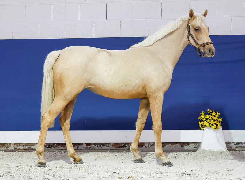 In unserer Kollektion stehen streng selektierte Youngster f�r alle Anspr�che: Ausbildungs-, Zucht- und Kinderponys Hier gelangen Sie zur Gesamtkollektion: https://ponyforum.auction Mit der edlen Palominostute Diese Eine steht ein weiterer Nachkomme des Siegerhengstes Damenstolz A im Lot. Mutter StPr Kalani R legte ihre Stutenleistungsprüfung mit der hervorragenden Endnote von 8,33 ab, sie ist eine Tochter des Vize-Bundeschampions Casino Gold.