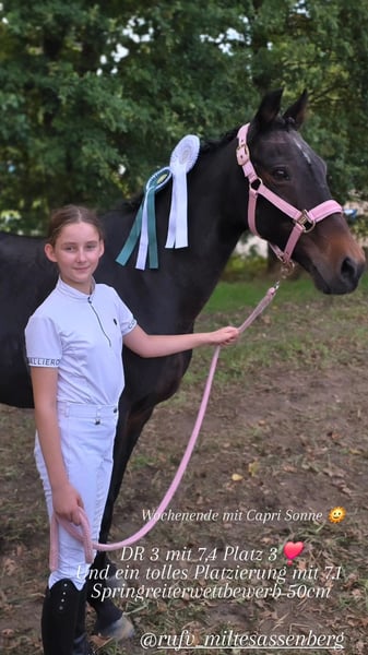 Capri Sonne ist ein gut ausgebildetes, zuverlässiges Kinderpony mit Turniererfahrung. Sie zeigt sich stets brav, rittig und konzentriert – sowohl im täglichen Training als auch im Turniereinsatz. Sie ist springfreudig und sicher unter dem Sattel. Mit ihr wurde aktuell erfolgreich das Reitabzeichen 5 abgelegt. In der Vergangenheit startete sie bis zur Klasse A** im Springen sowie Klasse A in der Dressur. Aufgrund ihres Charakters, ihrer Ausbildung und ihrer Erfahrung ist Capri Sonne das ideale Pony für Kinder. Kontakt nur per Anruf