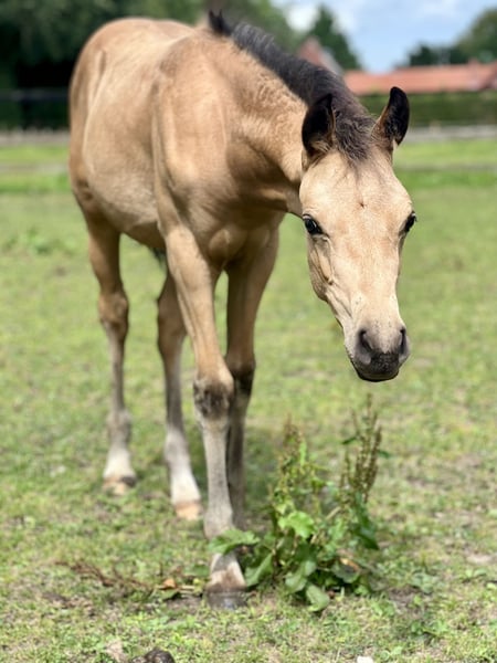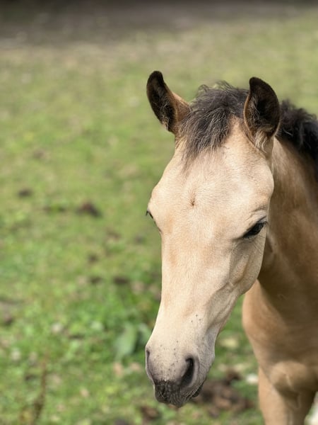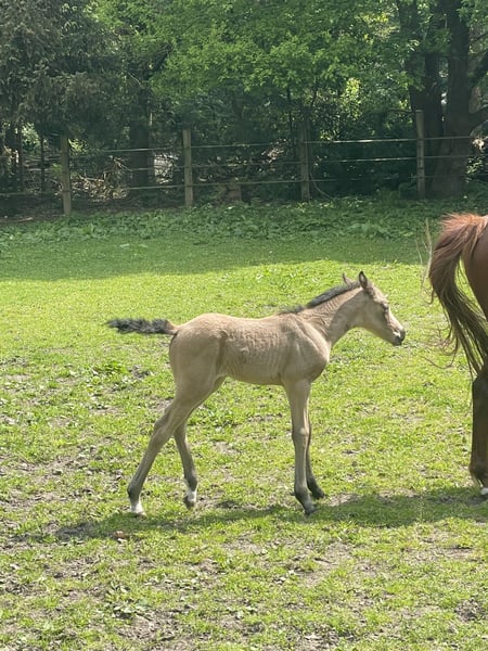 Wunderschöne 1-jährige Buckskin-Ponystute von Mescal – Fohlenprämie & Spitzenabstammung! ✨ Schweren Herzens gebe ich meine einjährige Ponystute in der seltenen Farbe Buckskin aus Zeitmangel in fördernde, liebevolle Hände ab. Sie ist eine freundliche, neugierige und menschenbezogene junge Dame, die das Führen, Putzen und Hufe geben bereits kennt. Aufgewachsen im Offenstall in einer kleinen Herde, zeigt sie sich sozial, ausgeglichen und sehr lernfreudig. Abstammung: Mescal x Brilliants Golden Boy x Kaiser Konrad Ihre Mutter ist im Springen bis zur Klasse M gegangen, der Vater Mescal überzeugt durch Typ, Rittigkeit und hervorragendes Springvermögen. Die junge Stute erhielt außerdem eine Fohlenprämie, was ihre Qualität in Typ, Bewegung und Ausdruck unterstreicht. Voraussichtliches Endmaß: ca. 1,45–1,48 m – sportliches Endmaßpony mit viel Perspektive für Sport, Freizeit oder Zucht. Ein echtes Schmuckstück mit Zukunft und Charme! Nachwuchsstute mit Herz, Köpfchen und viel Potenzial!