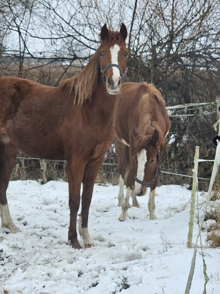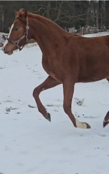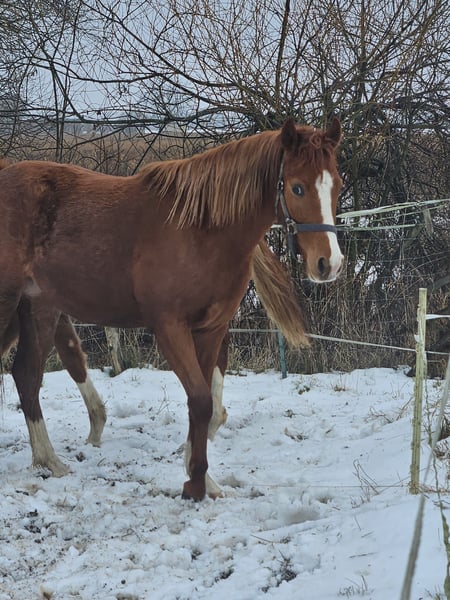 Elegant German Riding Pony mare, born in 2024, with a beautiful chestnut coat. This promising young prospect impresses with her appealing appearance and a promising temperament. She has already been gently started and displays a solid basic training. Thanks to her robust constitution and balanced nature, she is ideal for ambitious young riders or breeding enthusiasts who value quality and character. A great opportunity to bring a young, dressage-oriented Riding Pony with great potential into the future. She has excellent pedigree; the dam and half-sister can also be viewed on-site. We look forward to meeting you.