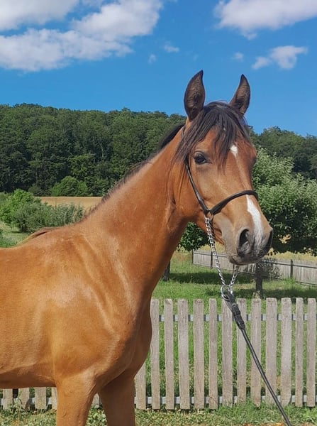For sale is a charming and promising mare, a German Riding Pony cross, born in 2023. She has a beautiful brown coat and stands at 14.0 hands. This young lady is perfect for leisure riding and offers great potential for future adventures. She is well-mannered and already displays a solid basic training. Ideal for riders seeking a loving and reliable pony that brings joy both in the arena and on the trail.
