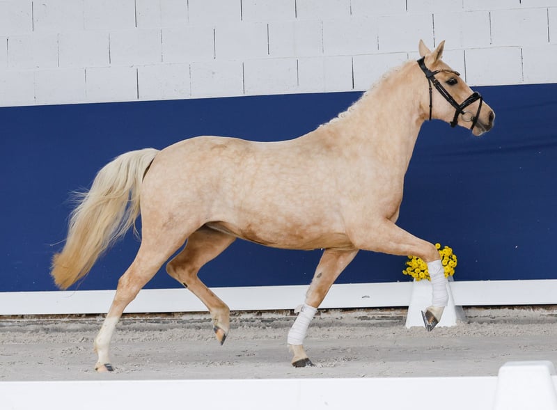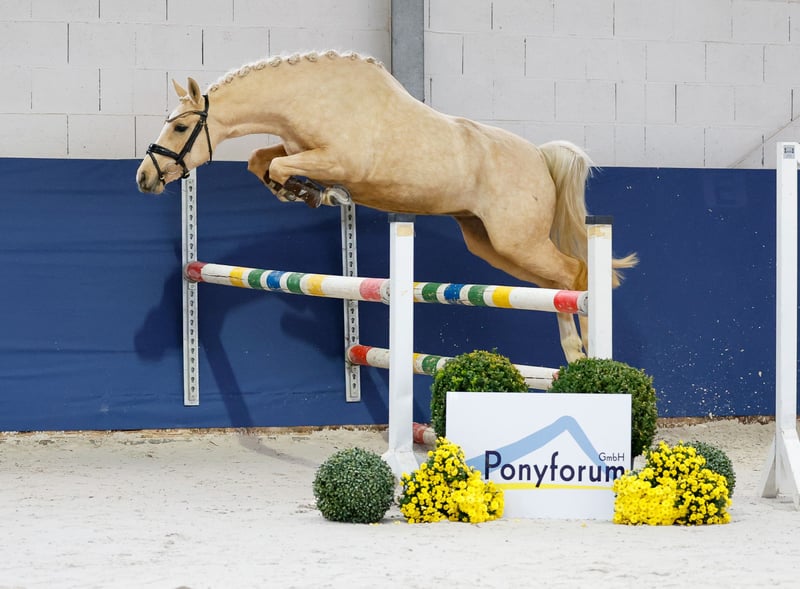 In unserer Kollektion stehen streng selektierte Youngster f�r alle Anspr�che: Ausbildungs-, Zucht- und Kinderponys Hier gelangen Sie zur Gesamtkollektion: https://ponyforum.auction Domino Dancing JM – unser kleines Superblondie mit dem großen Doppeltalent! Die hübsche mittelrahmige Palominostute ist ein großherziges Pony. Ihre Aufzucht auf einem Kinderponyhof merkt man ihr an, sie ist unerschrocken und absolut sozial zu anderen Ponys. Ihr Vater Mescal war Doppelbundeschampion der Springponys und setzte seine Reitportkarriere danach hocherfolgreich unter dem Dressursattel fort, er kann heute Viereckerfolge in der Klasse S verbuchen! Hier wächst ein toller Allrounder für die jüngeren Nachwuchsreiter heran, der mit seinem Doppeltalent perfekt für Familien ist! Direkt vom Züchter.