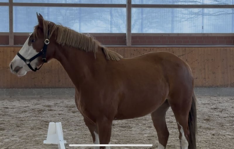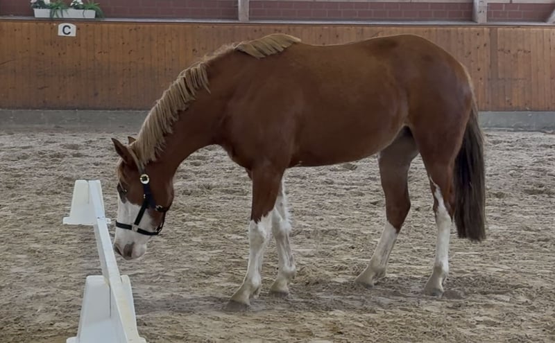 Big Stars Happiness“ ist eine 3jährige auffällig gezeichnete Nachwuchsstute für den Sport. Sie hat ein aktuelles Stockmaß von 1.43m und wird im Maß bleiben. Charakterlich eine sehr brave Stute mit go. Sie ist bisher am Halfter longiert und kennt das Freispringen. „Happy“ hat drei sehr gute GGA und macht einen vermögenden schönen Sprung. Ihre Mutter „St.Pr.St. Cascana“ war selbst Spring Siegerstute in Westfalen & macht sehr rittige und vielversprechende Sportponys. „Happy“s Halbschwester ist ebenfalls Spring Siegerin der Stutenschau in Westfalen. Ein Halbbruder und Vollbruder sind aktuell unter dem Sattel und starten in der kommenden Saison die ersten Springpferde Prüfungen. Der Vater „Big Star TF“ ist aktuell im Springen der Klasse M erfolgreich unterwegs. Happy eignet sich besonders als Nachwuchsstute für den Springsport, hat aber aufgrund ihrer guten GGA auch Perspektive in der Dressur.