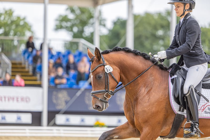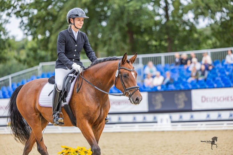 For sale is our charming, very people-oriented mare Raute. Raute was born with us and grew up in a herd environment with plenty of turnout. She is a state premium candidate (1 c prize) and was placed in the finals of the 3-year-old mares and geldings at the Bundeschampionat in Warendorf. Thus, she is the 4th best mare in the breeding book for German Riding Ponies of the 2022 crop. Raute has been gently started under saddle with us and is now being slowly prepared for a riding break after the championship. Particularly noteworthy is Raute's outstanding walk and her very elastic basic gaits, which were rated with scores of 8 and 9 at the elite mare show and in the riding horse tests. Raute has only had 3 starts in riding horse tests and has always been placed. A jewel for the big sport is maturing here. Raute's mother "Rominas Royal Lady WE" comes from the renowned breeding establishment Gestüt Kastanienhof/Coldewey. She is also a state premium candidate and was 3rd at the mare championship in Lienen. Not much needs to be said about Raute's father Dreidimensional AT; he is a multiple Westphalian and Bundeschampion and has already produced numerous licensed stallions and state premium daughters. Raute has never been seriously ill and has already been examined radiologically with no findings. She is being sold with a heavy heart into appreciative and supportive hands. If you are interested or have any questions, please feel free to contact me.