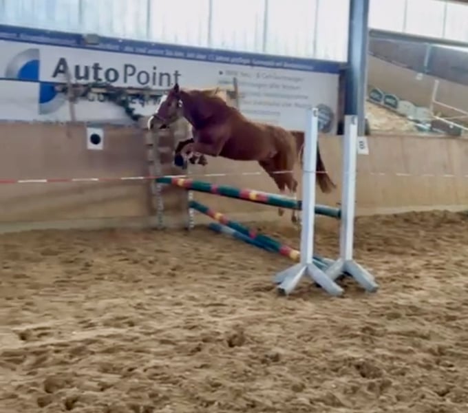 Verkaufe eine elegante Deutsche Reitpony-Stute, geboren im Jahr 2022. Klar im Kopf und sehr lernwillig. Wird von einem 14 jährigen Mädchen geritten. Die hübsche vierjährige Fuchsstute überzeugt durch ihre charmante Erscheinung und ihr freundliches Wesen. Mit einem Stockmaß von 146 cm ist sie perfekt für ambitionierte Nachwuchsreiter und Ponyreiter geeignet. Sie ist vielseitig im Springen ausgebildet und zeigt bereits viel Talent sowie eine gute Springtechnik. Dank ihres ausgeglichenen Charakters und ihrer guten Grundausbildung ist sie sowohl für den Sport als auch für den Freizeitbereich bestens geeignet. Diese vielversprechende Reitpony-Stute bietet eine hervorragende Basis für die weitere Ausbildung und Entwicklung. Sie ist gesund, gut rittig und bereits in der Haltung sowie im Umgang sehr zuverlässig. Ein echtes Pony für alle, die auf der Suche nach einem talentierten Nachwuchstalent sind!
