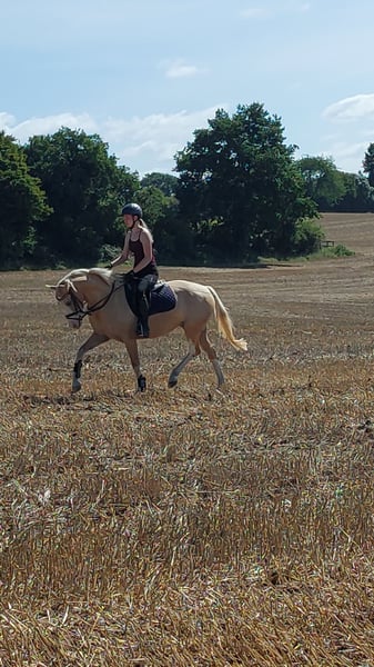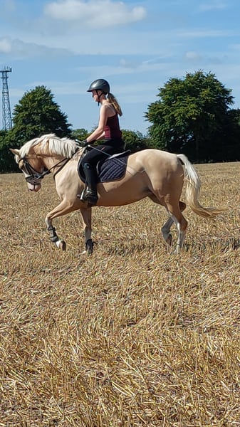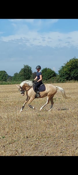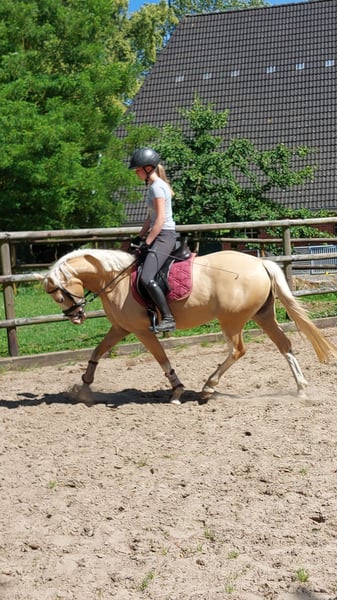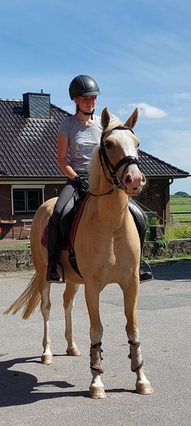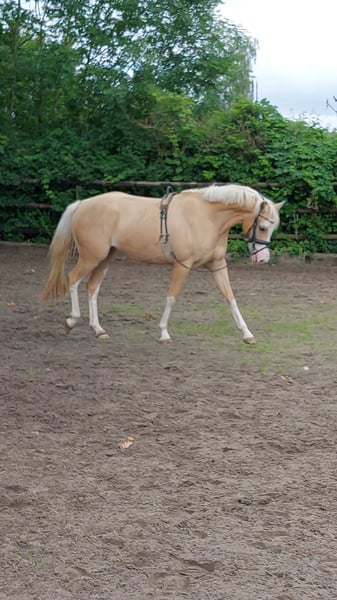 Lady Sunshine ist eine sehr typvolle Palomino Stute mit Qualität. Sie ist bei uns geboren und pferdegerecht im Herdenverband mit viel Auslauf aufgewachsen. Sie war bisher nie krank, läuft Barhuf und hat bereits Röntgenbilder ohne Befund. Mit einem Stockmaß von 150 cm hat sie eine tolle Größe, für evtl kleine Erwachsene, und deckt gut ab. Sunny ist schonend und solide angeritten. Sie lässt sich sehr gut auf dem Außenplatz reiten und war jetzt in letzter Zeit öfter für die Arbeit auf dem Stoppelfeld, was ihr sehr gut gefällt. Sie geht gut vorwärts und lässt sich gut an die Hilfen reiten, das fällt ihr nicht schwer. Eine Stute die Spaß an der Arbeit hat und engagiert ist. Ihre Bewegungen sind überdurchschnittlich gut, alle 3. Sie fußt sehr gut ab, und bei mehr Kraftentwicklung, werden die Bewegungen noch ausdrucksvoller werden. Mit dem Springen ist noch nicht begonnen worden, aber da liegt eindeutig Veranlagung in der Genetik. Und die ersten kleinen Sprünge beim Freispringen waren sehr vielversprechend. Ihre Mutter ist Elitestute, Sunny hat 3 gekörte Brüder. Sie ist regelmäßig entwurmt und kennt den Schmied. Sie kennt sowohl Boxenhaltung als auch Offenstallhaltung. Im Moment ist sie tagsüber auf der Weide, und über Nacht im Stall. Bei Interesse oder weiteren Fragen freuen wir uns auf Ihre Nachricht! Standort : Schleswig-Holstein