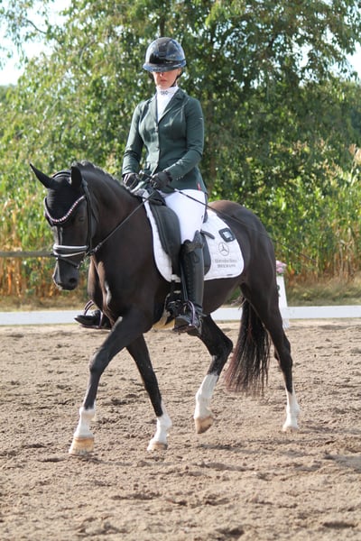 For sale is a very stylish and talented 5-year-old German Riding Pony mare with promising potential in dressage. She has already been presented in young horse classes and is currently confidently trained at the level of dressage horse class A. First lessons at the L-level have already begun. Her outstanding qualities include her excellent basic gaits, especially her remarkable walk, which has already been awarded a score of 8.0. The mare demonstrates: - Very well-behaved and uncomplicated in handling - Pleasant in daily management - Loadable without issues on her own - Safe and sensitive to ride even for younger riders - Motivated, eager to learn, and consistently reliable under saddle She is ideally suited for ambitious young riders and offers excellent conditions for further sporting development.