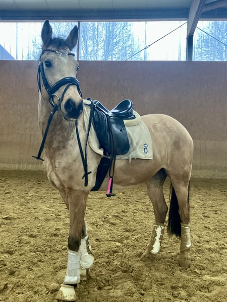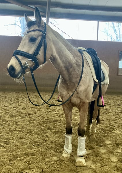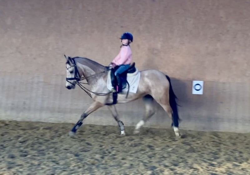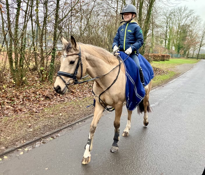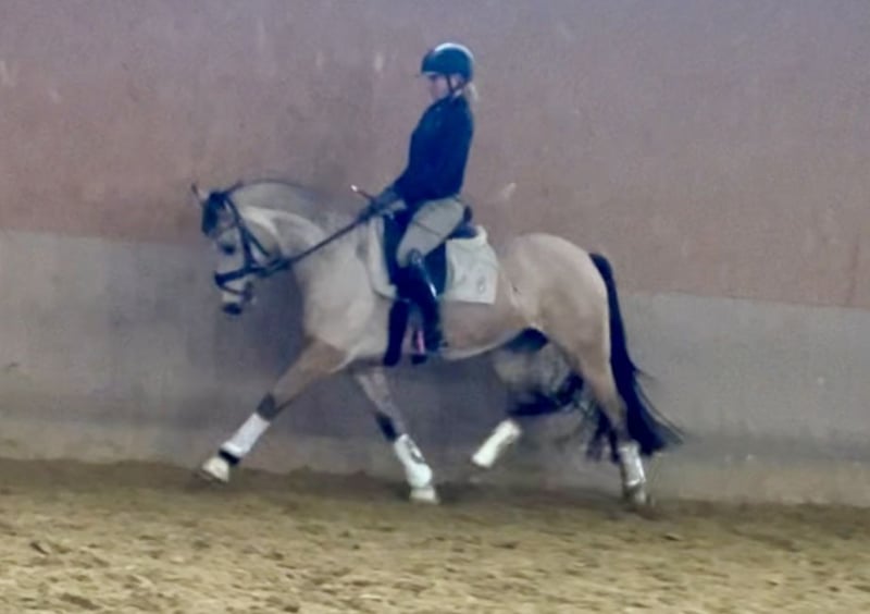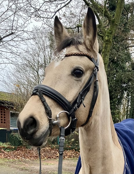 Zum Verkauf steht diese wunderschöne 5j. Deutsche Reitponystute v. D-Gold x Marabaibu in der Sonderfarbe Farbe, mit 1,46 m sicher im Ponymaß und drei sehr guten Grundgangarten ausgestattet. Sie wurde 4j. schonend angeritten, kennt Ausritte und hat auch bereits erste Turniererfahrung im Springen gesammelt. Sie befindet sich natürlich dem Alter entsprechend noch in der Ausbildung, zeigt aber sehr viel Potenzial für beide Disziplinen und ist daher sicher als künftiges Sportpony für den ambitionierten Reiter sehr interessant. Erste Erfahrungen mit kleinen Kindern hat sie bereits ebenfalls gemacht. Im täglichen Umgang ist sie lieb und umgänglich, dem Menschen sehr zugewandt und verschmust. In der Herde fügt sie sich gut ein und ist dort ebenfalls unkompliziert. Bislang war sie immer kerngesund. Bei weiteren Fragen und Informationen gerne auch telefonisch melden. Ausprobieren jederzeit möglich.