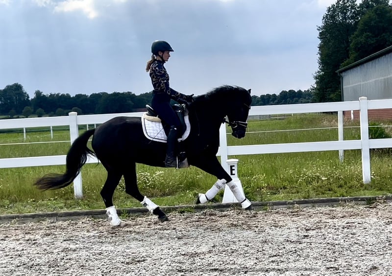 Standort: 49509 Recke | DR | Stute | Dunkelbraun| *2021 | 148 cm | v. Kent Nagano WE x Bartholomeo Mit „Nagini“ haben wir eine sehr schön aufgemachte Stute. „Nagini“ bringt neben ihrer tollen Aufmachung drei gute Grundgangarten mit. Sie verfügt bereits jetzt über eine sehr gute Rittigkeit und eine tolle Arbeitseinstellung. Die Stute ist leicht in der Anlehnung und möchte ihrem Reiter immer gefallen. Im Umgang ist sie absolut unkompliziert und unerschrocken. Aufgrund ihrer Abstammung können wir uns „Nagini“ in allen Sparten der Reiterei, sowie auch im Bereich des Fahrsports vorstellen. Aktuell ist „Nagini“ mit einer jugendlichen Reiterin E-Dressur platziert. Einen kleinen Parcours, sowie Geländesprünge meistert sie ebenfalls problemlos. Ihr Vater „Kent Nagano“ konnte sich bereits in jungen Jahren in FEI-Prüfungen platzieren. Ihr Muttervater „Bartholomeo“ ist dafür bekannt, dass er absolut kopfklare und rittige Ponys für den Freizeit-und Leistungssport hervorbringt. Er selbst konnte sich in der Dressur bis zur Klasse M und im Springen bis zur Klasse A platzieren. Seine Nachzucht kann zudem auch Erfolge in der Vielseitigkeit, wie auch im Fahrsport vorweisen. Mit der vielseitig veranlagten „Nagini“ stehen ihrem zukünftigen Reiter alle Türen offen, für Sport und Freizeit, sowie für die Zucht. Ein Röntgen-Tüv von 2024 incl. Rückenbilder liegt ohne Befund vor. https://youtu.be/w8SoTnji3uY?si=zZBOVAw_OQ353Ys6 Bei ernsthaftem Interesse melden Sie sich gerne telefonisch unter der +491707941333.
