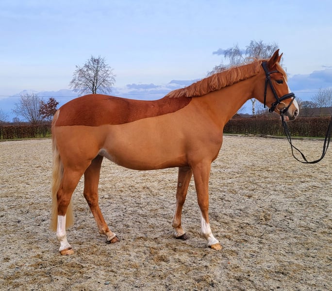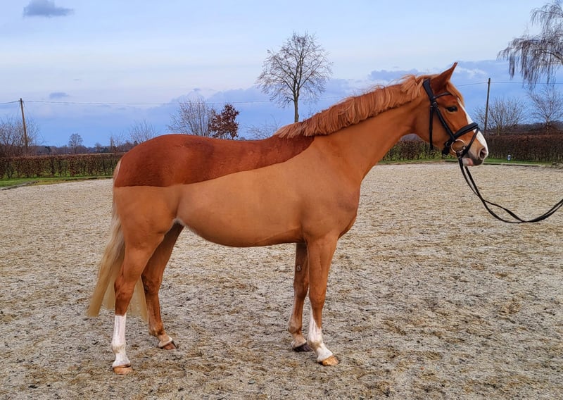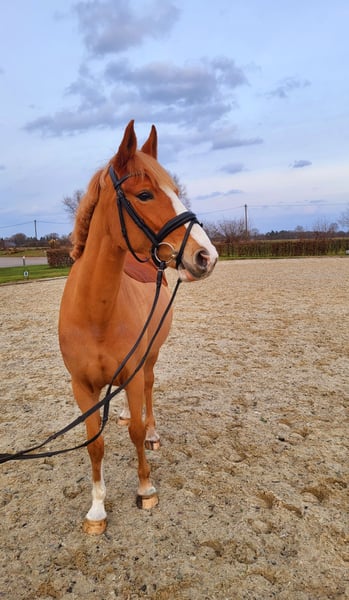 Diese bildschöne 5-jährige Stute „Marilyn Monroe HW“ stammt ab vom renommierten Welsh-B Hengst The Breas My Mobility, Scolari, Lord Loxley und ist im begehrten XL-Format von 1,56m. Durch ihre blonde Mähne, die breite Blässe und weißen Beine ist sie ein absoluter Hingucker. Marilyn hat einen sehr ausgeglichenen Charakter. Sie genießt den täglichen Weidegang mit ihren Freunden und ist ein sehr soziales und verträgliches Pferd. Aufmerksam und stets motiviert ist sie für jeden Spaß zu haben. Sie ist bereits geritten und wird derzeit dressurmäßig weiter ausgebildet. Viel Talent am Sprung zeigt Marilyn beim Freispringen. Wir wünschen uns ein liebevolles zu Hause für Marilyn mit tollen Haltungsbedingungen.