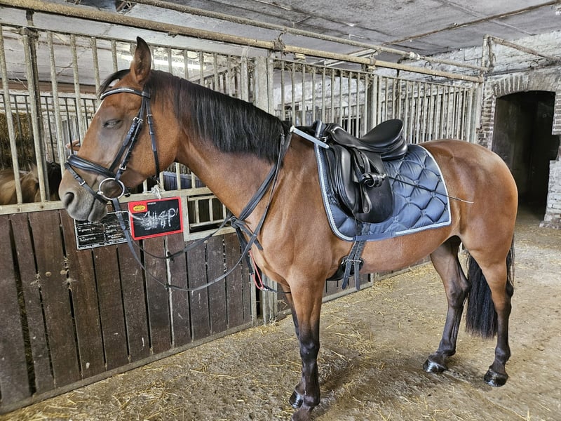 Zum Verkauf steht eine wunderschöne braune Deutsche Reitpony Stute aus April 2019. Sie hat ein Stockmaß von 144 cm und deckt auch Erwachsene gut ab. Sie wurde mit 4,5 Jahren schonend angeritten, stammt von DARK HIGHLIGHT AT x D-DAY AT ab und ist als Zuchtstute eingetragen. Ansprechende Erscheinung, freundlicher Charakter und hohe Lernbereitschaft. Sie hat ein gutes Grundtempo, ist brav im Umgang und in allen drei Gangarten gut zu reiten (mit und ohne Ausbinder) und dabei auf einem soliden A-Niveau. Auch erste Sprünge unterm Reiter hat sie bereits absolviert, dies wurde jedoch noch nicht weiter vertieft, da wir uns auf die Dressur konzentriert haben. Beim Freispringen zeigt sie viel Spaß und Potenzial. Sie hat sehr gute Hufe und ist barhuf unterwegs. Beim Hufschmied zeigt sie sich stets fromm. Aktuell wird sie von zwei jüngeren Kindern (9 und 12) sowie von einem Trainer geritten. Ideal auch für ein Eltern/Kind-Gespann mit Reiterfahrung. Sie ist kein Anfänger- oder reines Kinderpony und braucht einen erfahrenen und konsequenten Reiter, der sie weiter ausbilden und fördern kann. Im Umgang mit unsicheren Reitern zeigt sie sich manchmal etwas schreckhaft, was jedoch durch vom Reiter vermittelte Sicherheit ausgeglichen werden kann, hier braucht sie einfach noch mehr Erfahrung. Sie ist aktuell geimpft, entwurmt und besitzt einen aktuellen Pass. Sie steht momentan in Boxenhaltung, in einer gemischten Herde aus alten und jungen Ponys, wo sie sich sehr verträglich zeigt. Sie benötigt auf jeden Fall aber das ganze Jahr über Auslauf und Bewegung. Auch ein Offenstall oder Aktivstall wäre ideal. Gesundheitlich hat sie sich bei uns robust und unanfällig gezeigt, eine AKU auf eigene Kosten kann gerne von einem Tierarzt nach Wahl durchgeführt werden. Eventuell kommt auch eine Zurverfügungstellung (bei voller Kostenübernahme) in einen näheren Umkreis für uns in Frage. Für weitere Informationen oder einen Besichtigungstermin stehe ich Ihnen gerne zur Verfügung, bitte kontaktieren Sie mich per Mail, gerne rufe ich auch zurück. Videos können gerne auf Anfrage zugesendet werden. Melden Sie sich gerne bei Interesse!