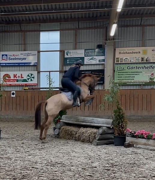 Fakten voran: - Deutsches Reitpony - 6 Jahre - 1.50m (deckt auch Erwachsene bis 1.70m gut ab) - fuchsfalbe mit Alstrich - Allrounder mit Schwerpunkt Springen/VS - geländesicher - absolut unerschrocken - gesund Djinny ist ein Deutsches Reitpony, 6 jährig, 1.50m und Fuchsfalbe mit Alstrich. Sie ist sehr unerschrocken, es gibt nichts was sie aus der Ruhe bringt (laute Geräusche, Trubel, fremde Umgebungen, bellende Hunde- alles egal). Sie ist ein echter Allrounder! Ob am langen Zügel alleine durchs Gelände oder Parcoursspringen, sie ist bei allem dabei. Gelände und Springen sind auch die Dinge die ihr am meisten Freude bereiten. Beim springen ist sie sehr talentiert und zuverlässig am Sprung. Alles in einem ein tolles Pony für den ambitionierten Freizeitbereich oder auch für den Sport!