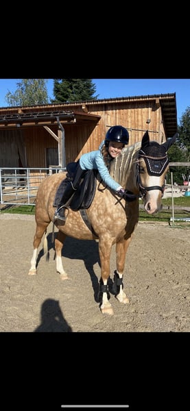 Verkaufe wegen Reitsportaufgabe meine 7 Jährige Deutsche Reitponystute Goldmarie. Sie ist eine sehr sensible und feinfühlige Stute die aber trotzdem Konsequenz und Struktur braucht. Ich habe sie seit Jährling, sie stand bei mir immer im Offenstall, ist sehr sozial und braucht den Auslauf. Boxenhaltung akzeptiert sie zwar, sie wird aber schnell ungeduldig und fängt an an der Türe zu klopfen usw. 24h Heu funktioniert leider auch nicht so gut, ich kann ihr aber leider nichts anderes bieten und daher war sie bei mir immer viel zu dick. Sie braucht ebenfalls begrenzten Weidegang, typisch Pony eben. Sie wurde schonend angeritten , ist sehr fein an den Hilfen wurde aber das letzte Jahr fast nur vom Boden aus gearbeitet bzw ausgeritten. Geht alleine und in der Gruppe ins Gelände, ist aber teilweise schreckhaft. Generell eher nichts für Anfänger oder Kinder, man sollte schon sattelfest sein und Erfahrung mit jungen Pferden haben. Sie hatte 2024 eine Plazentitis und dadurch leider eine Totgeburt. Sie wurde dannach gut behandelt und gespült, wir haben sie aber dann nicht mehr gedeckt. Ob man sie zur Zucht verwenden könnte, müsste man vorher ordentlich abklären. Sie ist vorne beschlagen weil unser Gelände sehr steinig und viel Straße ist, beim Hufschmied und Tierarzt verhält sie sich vorbildlich. Hängerfahren ist grundsätzlich kein Problem. Ich verkaufe Goldi nur weil Sie zu schade zum rumstehen ist und einfach immer dicker wird. Vielleicht bekommt sie die Chance bei jemanden der sie schätzt und ordentlich mit ihr arbeit. Bitte keine reinen Preisanfragen, probreiten ist momentan aufgrund des Winters nur bedingt möglich, sie wird mit komplettem Zubehör verkauft. Gerne per whatsapp anfragen, bin telefonisch immer erst ab 15 Uhr erreichbar.