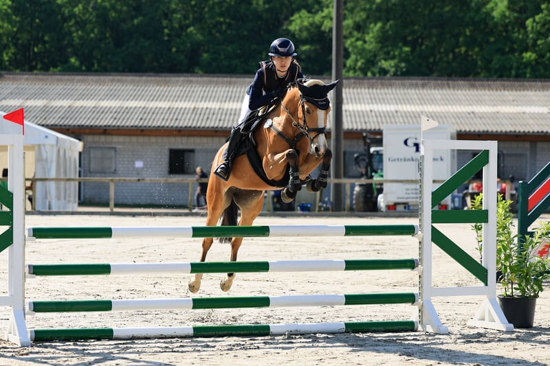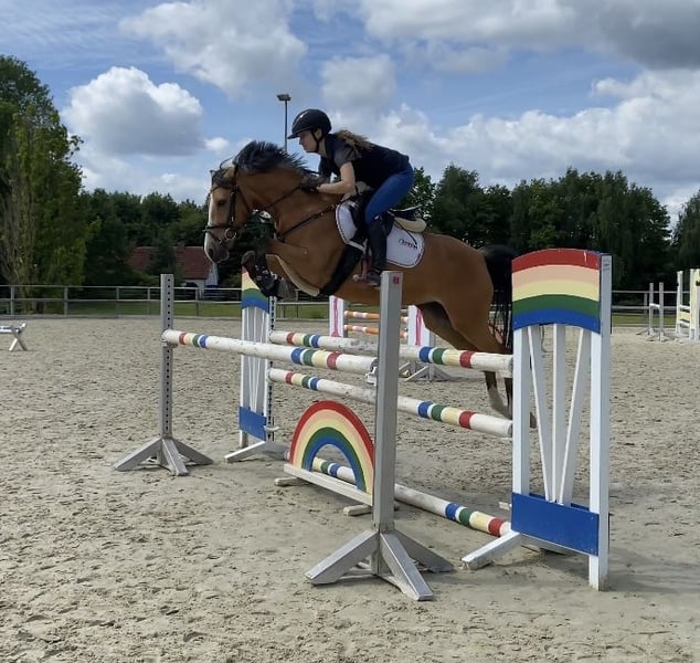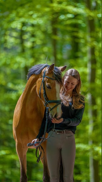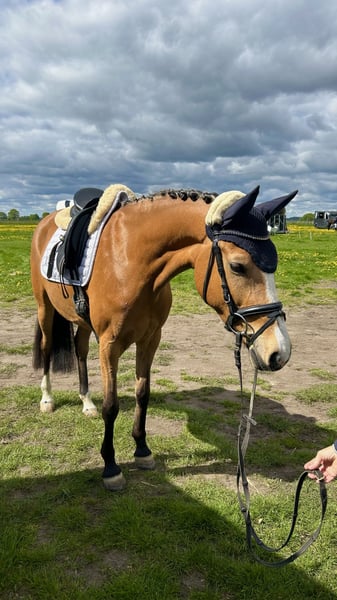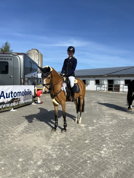 Excellent German riding pony mare in a special color, available directly from the breeder! Due to the cessation of her breeding career, our striking pony mare Catinka is for sale. What sets Catinka apart is her outstanding manners and her talent over fences. She has achieved numerous placings and wins in show jumping competitions at levels A* and A**, with many scores above 8. She is very cautious and prefers to avoid mistakes. She naturally masters flying changes flawlessly. At age 5, she qualified for the Bundeschampionat of riding ponies. This pony mare impresses in daily work especially through her rideability and work ethic. She has a pleasant go and always listens attentively, making her very manageable. Thanks to her willingness to learn and her rideability, Catinka has also been repeatedly highly placed in L-level dressage competitions. Catinka is very sweet and well-behaved, familiar with dogs, tractors, and children. She is shoe and loading safe. She can be ridden alone comfortably, even on open fields, and she also rides great without a saddle. She is very suitable for children to ride, but we do not sell her as a beginner pony. Her dam (last picture) also comes from our own breeding and was placed in Spring Pony L at age 5. Her sire has been successful in jumping at A-level and later competed successfully in FEI dressage. Inquiries only by phone or WhatsApp at: 0159 02479930