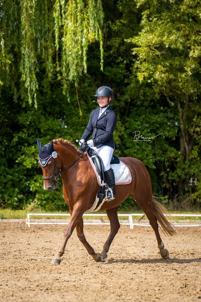 German Riding Pony – Mare, 8 years, 1.48 m We are selling our beautiful eight-year-old riding pony mare Querida (Sire: Quarterback’s Junior, Elite foal). She impresses with great basic gaits, a lot of potential for dressage, and absolute reliability. • Currently successful up to Dressage A, training at L level • Multiple placements, including Vice District Champion Dressage A (2025) • Well-behaved at competitions, no rearing or bucking • Smooth to ride, responsive to aids, offers excellent riding comfort • Shoeing and loading friendly, goes out alone and in groups • Currently kept in an open stable, also familiar with stalls Querida has a Kissing Spines diagnosis, which does not cause any problems with appropriate ground work (e.g., pole work). Jumping is excluded due to an old injury, but she is fully capable in dressage. We are looking for a loving home with a focus on dressage. The right place is more important to us than the price. A trial period of up to four weeks can be arranged. Saddle and accessories can be taken over. No urgent sale – not for school use! Videos and further information available upon request. ☎️ 0178-1604554