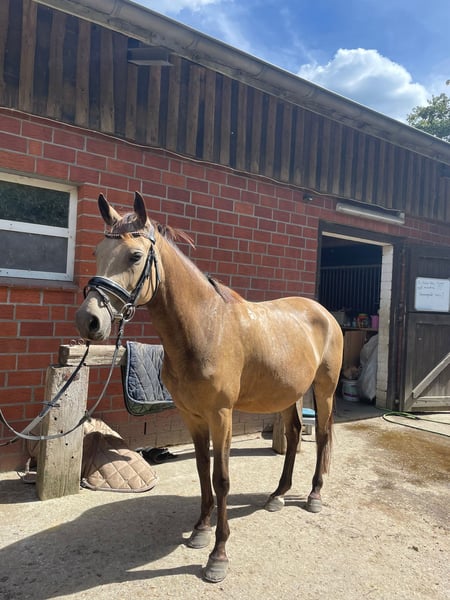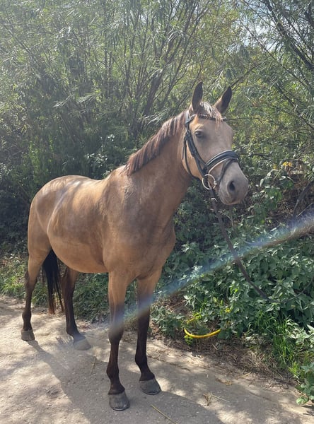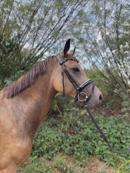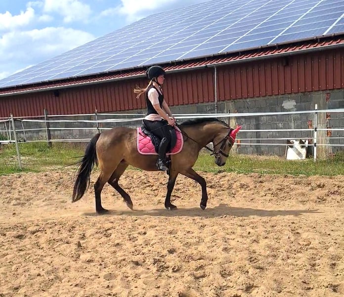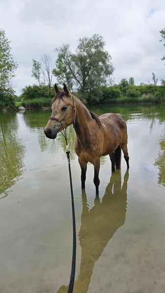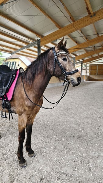 Schweren Herzens suchen ich für meine Deutsche Reitponystute ein passendes Zuhause. Sie ist eine wunderschöne, typvolle Buckskin-Stute mit toller Ausstrahlung und drei sehr schönen Grundgangarten – vor allem aber ein Pferd mit unfassbar viel Potenzial, das noch längst nicht ausgeschöpft ist. Sie ist sehr feinfühlig, sensibel und unglaublich lernwillig. Sie möchte alles richtig machen, denkt mit und entwickelt sich mit dem richtigen Menschen stetig weiter. Ein Pony, das Spaß macht zu arbeiten und sich weiter formen lässt. Sie bringt viel Go und einen guten Vorwärtsdrang mit und möchte regelmäßig gearbeitet werden. Daher ist sie kein Anfängerpony, auch wenn sie Kinder sehr mag. Sie sucht einen sicheren Reiter mit Gefühl, der ihr klare, ruhige Führung gibt. Sie deckt auch kleinere Erwachsene Reiter gut ab. Sie geht alleine und in der Gruppe ins Gelände und hat bereits erste Erfahrungen im Turniersport gesammelt. Im Umgang ist sie unkompliziert, schmiede- und verladefromm. Aktuell steht sie im Offenstall, kennt aber auch Boxenhaltung. Sie ist im Stutbuch I eingetragen und hat bereits ein gesundes Hengstfohlen gebracht. Hat man sie einmal auf seiner Seite, bindet sie sich eng und gibt ihrem Menschen sehr viel zurück. In neuen oder unsicheren Situationen kann sie auch mal über reagieren – daher wünschen wir uns erfahrene Hände. Wünsche mir für sie einen Platz, an dem sie einfühlsam gefördert wird und ihr Potenzial voll entfalten kann. Gerne kann ein gut passender Sattel und weiteres Zubehör mit erworben werden. Erste Kontaktaufnahme gern per WhatsApp