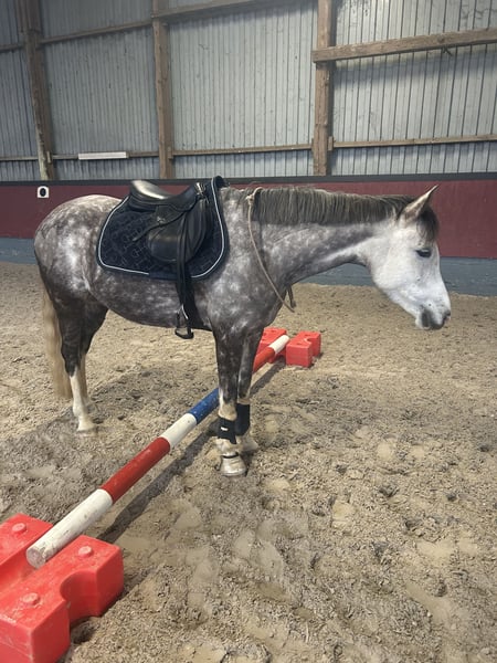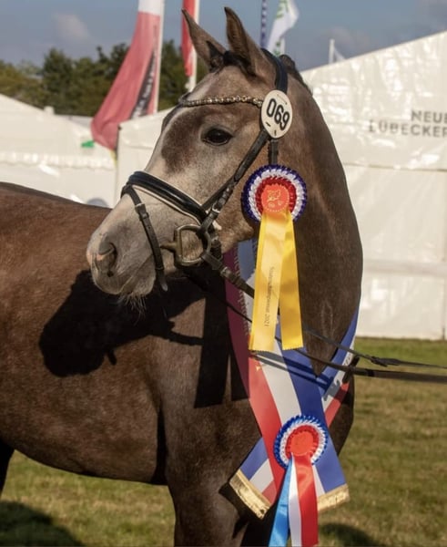 With a heavy heart, I am parting with my XL riding pony mare "Petit Helouis" *2018 by Numerus Clausus out of the state premium mare Petit Hailey Hope by Monte Christo x Hattrick. I acquired her directly from the breeders in 2022. Her siblings are already successfully competing in sports, and the mare herself is versatile: In show jumping, she actively seeks the jump and is very enthusiastic about it. She has gained experience during external training on the arena and in the cross-country park and has presented herself well. However, Helouis was not further developed in this direction, as she was originally intended for the Mounted Games sport, which she has unfortunately "outgrown." Nevertheless, she participated in various tournaments last season and demonstrated her strong nerves and willingness to learn. Helouis is also quite interesting for breeding: She received, among other accolades, the foal premium from the SH/HH horse registry with a score of 8.0, won the title of performance mare in 2021, and was also awarded state premium mare and breed winner at the NORLA mare championship in the same year. The mare not only impresses with her appearance and dynamic gaits but also with a golden character! She has always been very people-oriented, friendly in handling, and 100% clear-headed. During rides in the forest, on the stubble field, or at the beach, she thrives, remains controllable, shows no vices, and pays attention to her rider. She also demonstrates a strong willingness to learn in lunging, groundwork, and other activities, responding very well to voice commands. Due to her age, she still needs a rider who can provide her with calmness and security, as she can be a bit spooky at times (never maliciously!). Helouis can be loaded easily and independently from the start, is farrier-friendly, and has been regularly vaccinated. She is accustomed to open stable housing; currently, she is on pasture during the day and in a box at night. She remains calm even when alone, in unfamiliar environments, or at overnight tournaments. I wish for Helouis to find experienced and nurturing hands that can offer her a 5-star home where fun is not neglected. This is not an urgent sale! Sale to dealers or making her available is not an option, and I kindly ask to refrain from inquiries of this nature. No illnesses are known or have occurred. A veterinary examination/X-rays from 2022 are available with no findings. For inquiries, please contact me by phone or WhatsApp at 01746890440. A trial ride is possible by arrangement.
