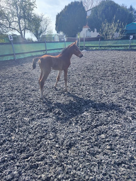 Excellence in Series: The Genetics of Champions This bay filly (born April 6, 2026) combines the best that German show jumping pony breeding has to offer today. Sire: Del Drago – The reigning national champion of 5-year-old show jumping ponies (score 8.7!). He impressed judges and spectators alike with his composure, modern conformation, and quick reflexes. Dam’s sire: Del Piero – A foundational bloodline for rideability and attitude. Del Piero has achieved international success with various young riders (including team gold at the Nations Cup) and is a proven producer of Bundeschampions. A raw diamond for the highest demands This foal captivates not only with its outstanding pedigree but also with correct conformation and a very lively, people-oriented nature. If you are looking for a partner for the show jumping arena who has absorbed the will to perform almost “with the mother’s milk,” you will find it here. Important data: Type: Pony filly (Dresden Riding Pony) Pedigree: Del Drago x Del Piero Color: Bay Potential: Show jumping / Eventing 📸 Note on the photos: Initial impressions can be seen in the gallery. As the little one continues to develop every day, additional current photos and videos will be added in the coming days. Feel free to check back or contact me directly!