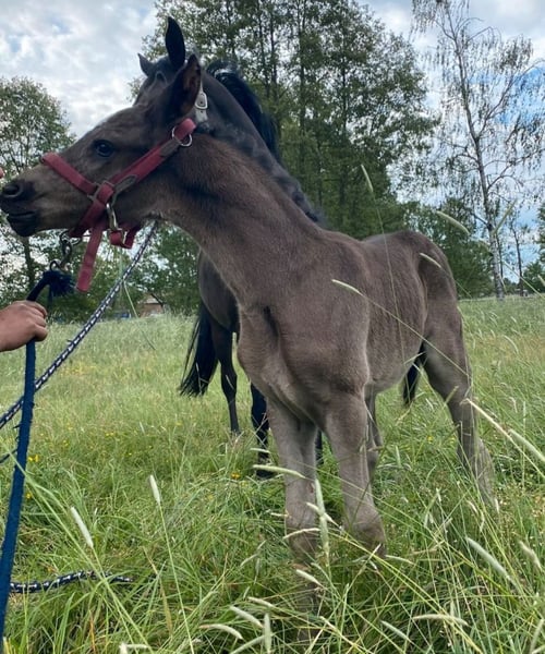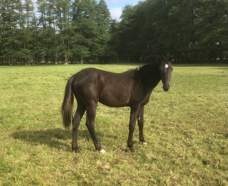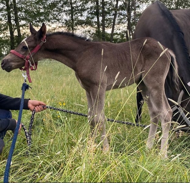 German Riding Pony for Sale in Black Coating. “De Candero E” alias “Dero” impresses not only with his beautiful black coat and white tail but also with his outstanding movements. He was awarded the foal premium as reserve champion at the foal show in Prussendorf. Here, two popular stallions of the highest class come together. “Dance Monkey EH” What a head-turner! Dance Monkey EH fascinates with his charm, incredible suppleness, and elasticity. An extremely athletic stallion with a consistently active hind leg, a lot of natural balance, and carrying capacity. The sire Dreidimensional AT NRW was the second reserve champion, two-time Westphalian champion, and dressage pony federal champion. He won in M-level dressage horse and L-level dressage tests. Over 30 of his sons have been licensed. “Don Mour.” He was not only awarded for his movements but is also a true champion, and his offspring are showing great success, whether in sports or breeding. Dero was born on May 10, 2024, and is expected to remain a suitable size. Once he gets to know his person, he is a very trusting and affectionate guy. He loves to cuddle and snuggle. He is already familiar with the foal ABC and learns diligently and joyfully. Dero is very open to other horses and always eager for new experiences. He will surely become an interesting sports partner later on and can also be very interesting for further breeding. He carries the genes for it. If you are interested or have questions, please feel free to contact me. Videos can be sent upon request. Best regards.