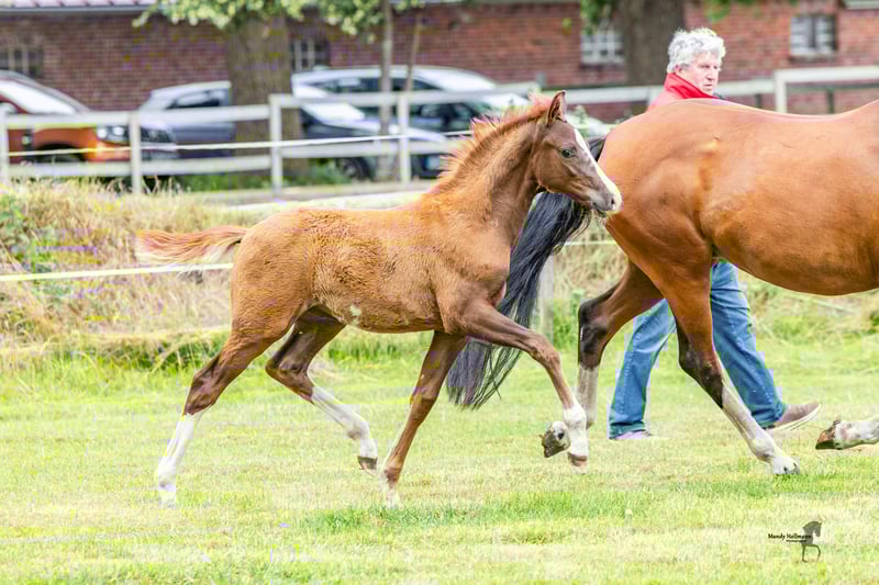 **Sales Advertisement: German Riding Pony Stallion** For sale is a promising German Riding Pony stallion, born in 2025. With an estimated final height of 148 cm and his striking chestnut color, he attracts all attention. This talented stallion is well-suited for dressage. He has harmonious movement and a pleasant temperament, making him an ideal partner for ambitious riders. He is well-mannered, easy to handle, and has a friendly disposition. Whether for leisure or competition, this stallion offers many opportunities and will surely bring a lot of joy. If you are interested or have any further questions, please feel free to contact me. Viewings can be arranged by appointment. Don't miss this chance!