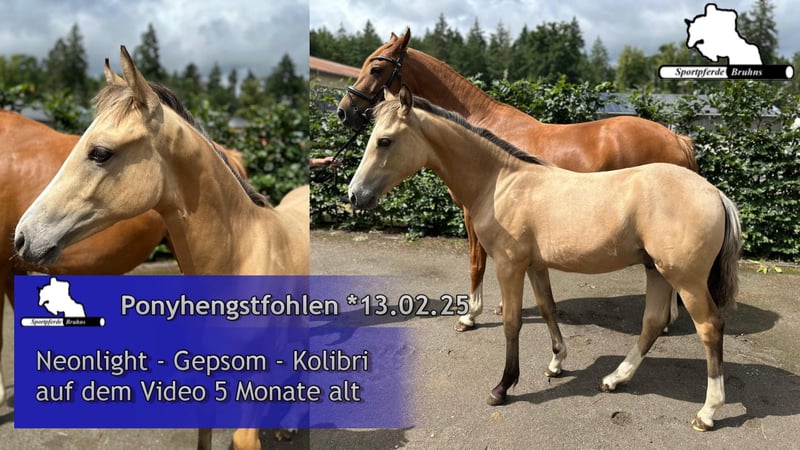 Wij bieden een springgericht ponyhengstveulen in een bijzondere kleur, dat al laat zien waarvoor het is geboren. Een levendige en springgeïnteresseerde jongen die nu al weet hoe het moet. De vader, Neonlight, kwalificeerde zich vorig jaar voor de Bundeschampionat bij de springponys. De moeder is een te klein gebleven warmbloedmerrie die zelf succesvol was in springen tot en met klasse M. Ze is ook een dochter van een S/1,40m-winnende merrie, volle zus van een S/1,40m-springpaard en halfzus van meerdere S***/1,50m-springpaarden met succes. De grootvader van de moeder, Gepsom, was lange tijd onze sportieve nr. 1 in de stal en behaalde successen tot S****/1,55m niveau.