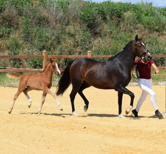 **Advertisement for sale: German Riding Pony Stallion** For sale is a promising German Riding Pony stallion, born in 2024. This charming chestnut impresses with his appealing conformation and a height of approx. 147 cm (estimated in 3 years), which makes him an ideal partner for dressage/jumping or even for breeding. His potential in dressage is already evident in his movements, which are convincing due to their elegance and expressiveness. The stallion has an excellent pedigree, which offers him the best prerequisites for a successful career in sport and breeding. This young stallion is not only an eye-catcher, but also a reliable companion with a friendly nature. He is ideal for ambitious riders who are looking for a talented youngster for both sport and breeding. If you are interested and would like further information, please do not hesitate to contact us.