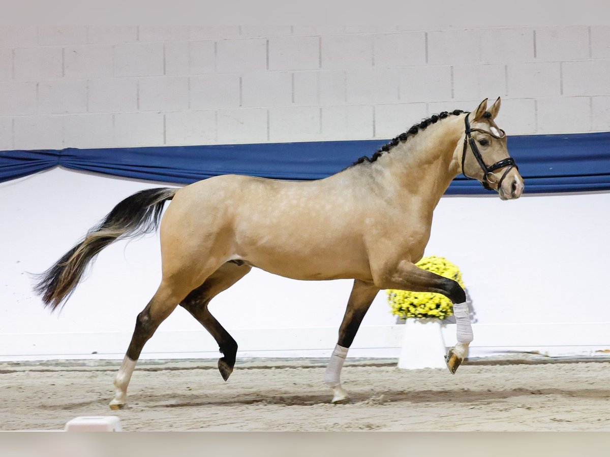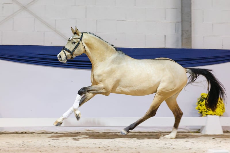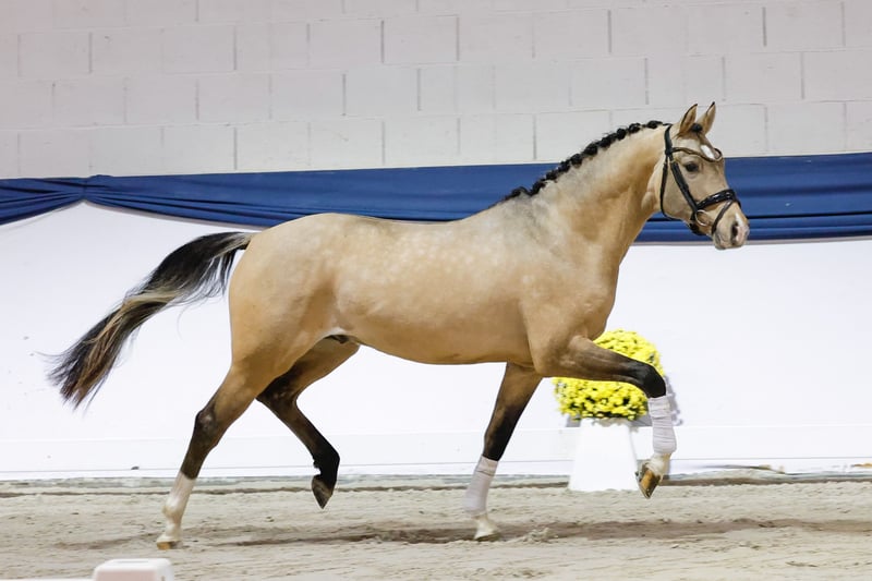 In unserer Kollektion stehen streng selektierte Youngster f�r alle Anspr�che: Ausbildungs-, Zucht- und Kinderponys Hier gelangen Sie zur Gesamtkollektion: https://ponyforum.auction Ein gekörter XL-Hengst aus dem 1. Jahrgang des viel besprochenen Gold Garants bereichert unser Auktionslot! Der typ- und bewegungsstarke Zöthens Goldstern begeisterte mit seiner hohen Grundqualität und Präsenz schon die Körkommission in Prussendorf und erhielt ein positives Körurteil. Mit seinen langen Linien und der großen Aufmachung wird Goldstern zukünftig das perfekte Damenreitpferd sein, ein gang- und typstarkes XL-Pony als absoluter Eyecatcher im Stall. Bestes Dressurblut fließt übrigens auch durch den Mutterstamm in seinen Adern, so steht hier u.a. der Erfolgsvererber Belissimo M, der besonders durch seinen Sohn Benicio neue Maßstäbe in der Dressurpferdezucht setzen konnte. Goldstern ist schon sehr gut longiert und er kennt - und liebt - das Freispringen.