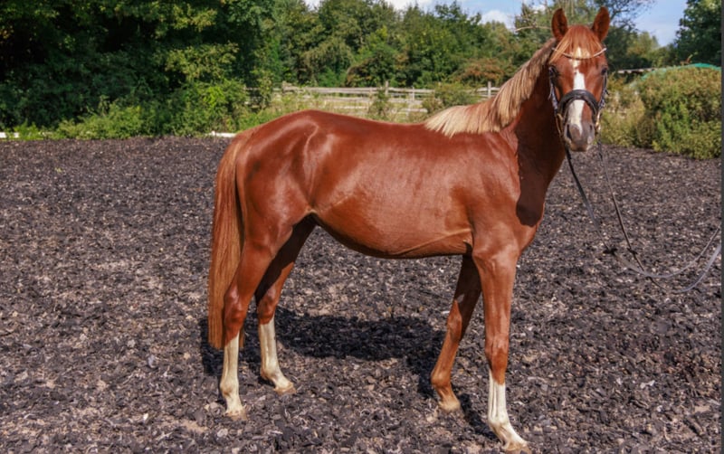 **Sales Advertisement: German Riding Pony Stallion** For sale is a beautiful German Riding Pony stallion, born in 2022. This dark chestnut impresses with his charming personality and promising potential in dressage. Furthermore, he has a very nice jump. **Features:** - **Breed:** German Riding Pony - **Gender:** Stallion - **Year of Birth:** 2022 - **Color:** Dark Chestnut - **Height:** 141 cm - **Discipline:** Dressage Our stallion already shows promising approaches in dressage work and has a wonderful, eager-to-learn temperament. With his three very good basic gaits, he is a worthy descendant of his magnificent father and a candidate for the FEI tour. He is well-mannered and already performs all basic gaits. He is suitable for both experienced riders and ambitious young riders who enjoy dressage and are looking for a reliable partner. If you are interested or would like more information, we look forward to your message!