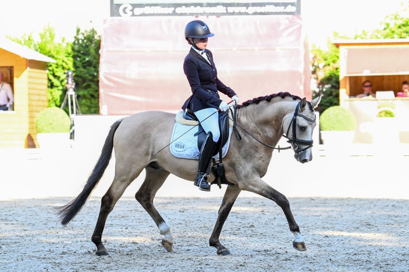 **Sales Advertisement: German Riding Pony Stallion** For sale is a beautiful German Riding Pony stallion, born in 2019. With his striking buckskin coat and a height of 14.2 hh, he is not only a real eye-catcher but also a talented partner for dressage. This stallion impresses with his excellent movements and eagerness to learn. He is well-mannered, well-educated, and shows great potential for dressage sport. Ideal for ambitious riders looking for a reliable and talented pony. www.gestuet-boenniger.de He is suitable for both recreational riding and competition and is ready to start his journey with a new rider. If you are interested or need more information, please feel free to contact me. Viewings are possible by appointment. We look forward to your inquiry!