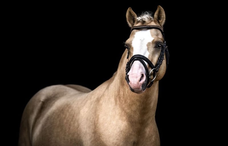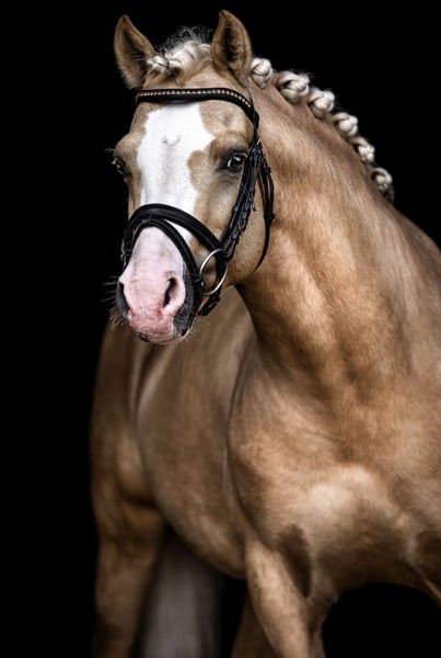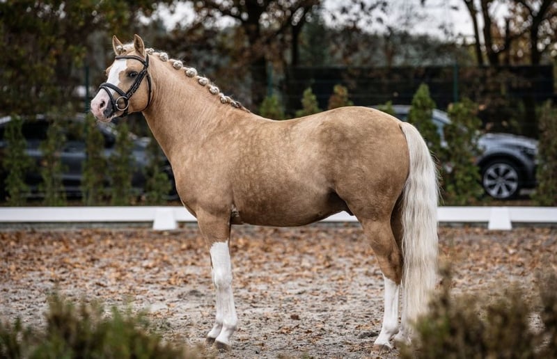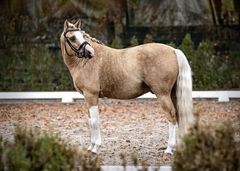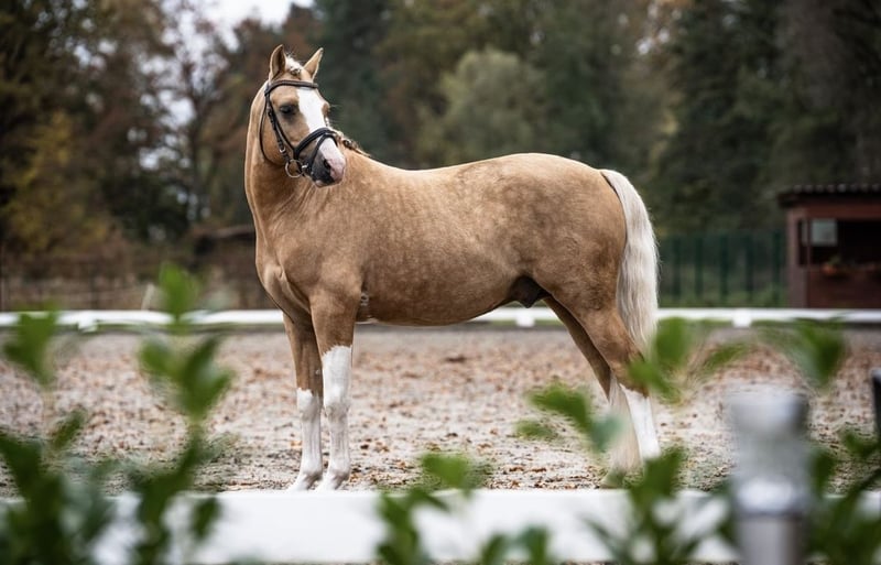 For sale is an exceptionally attractive riding pony stallion in the sought-after Palomino color. With his striking blaze and four high white socks, he captures everyone's attention. Despite his stallion status, he is very easy to handle in daily life and shows no typical stallion manners. He is very well-behaved at the blacksmith and loads effortlessly. The stallion is easy to ride and impresses with his rideability and pleasant temperament. He already masters all movements of class L and is suitable for both ambitious leisure riders and those starting in competitions. He comes directly from the breeder. Unfortunately, he has not reached his full height. If you are interested or would like more information, we look forward to hearing from you.